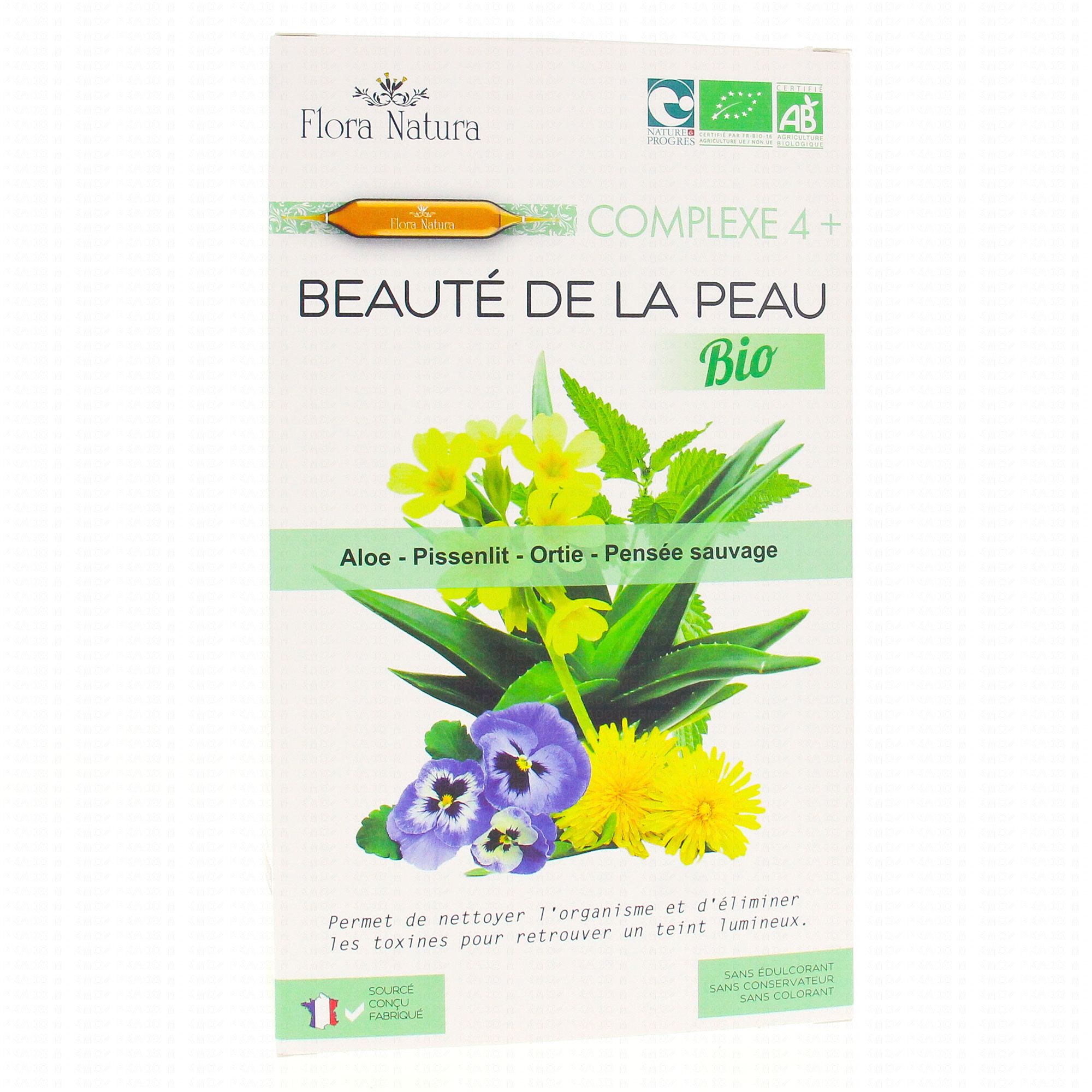 FLORA NATURA Complexe 4+ Beauté de la peau Bio 20 Ampoules de 15ml est un complément alimentaire qui contribue à maintenir la peau en bonne santé grâce à l'Aloé Vera qui est riche en anti-oxydant. La Pensée sauvage, le Pissenlit et la Grande ortie aident à maintenir la beauté de la peau.