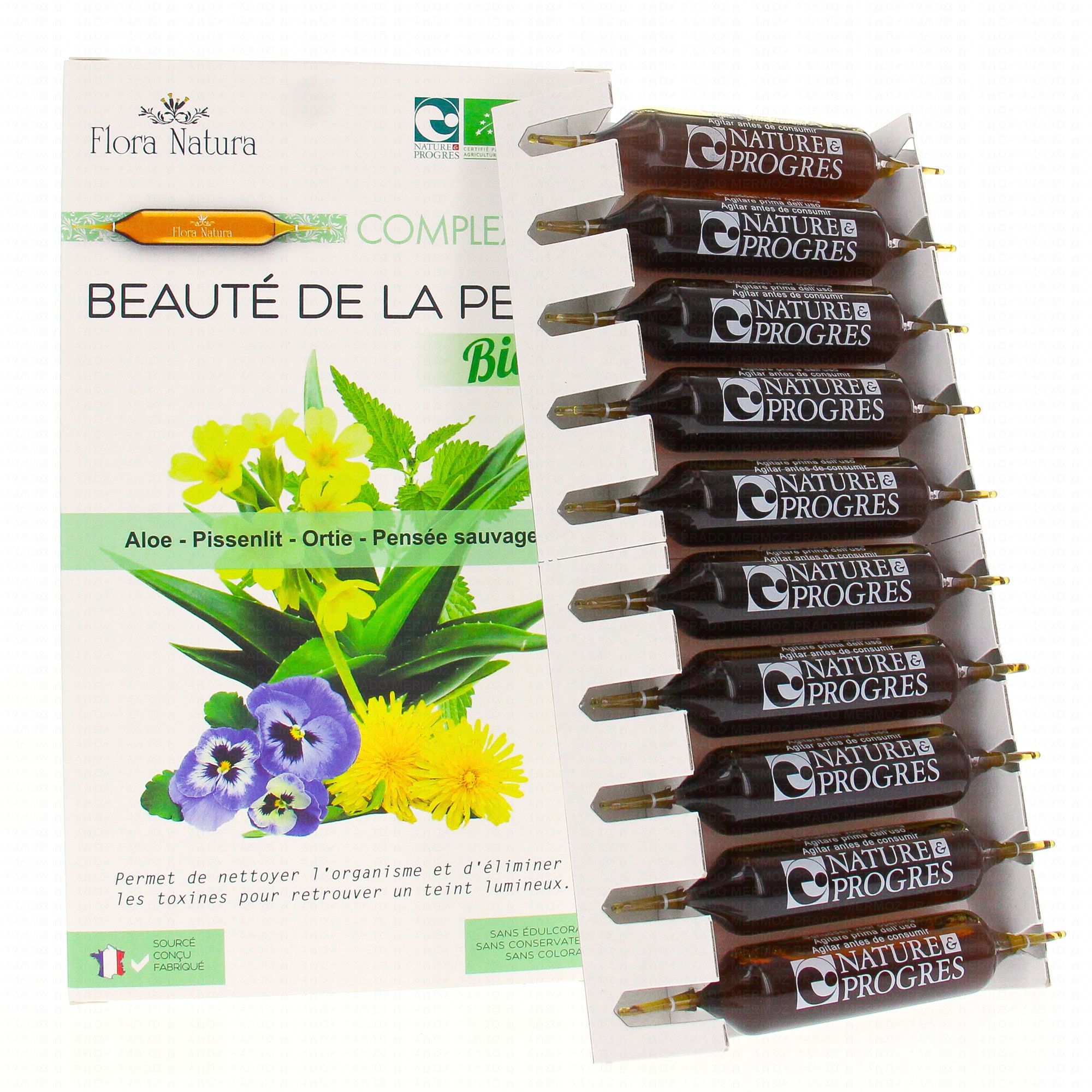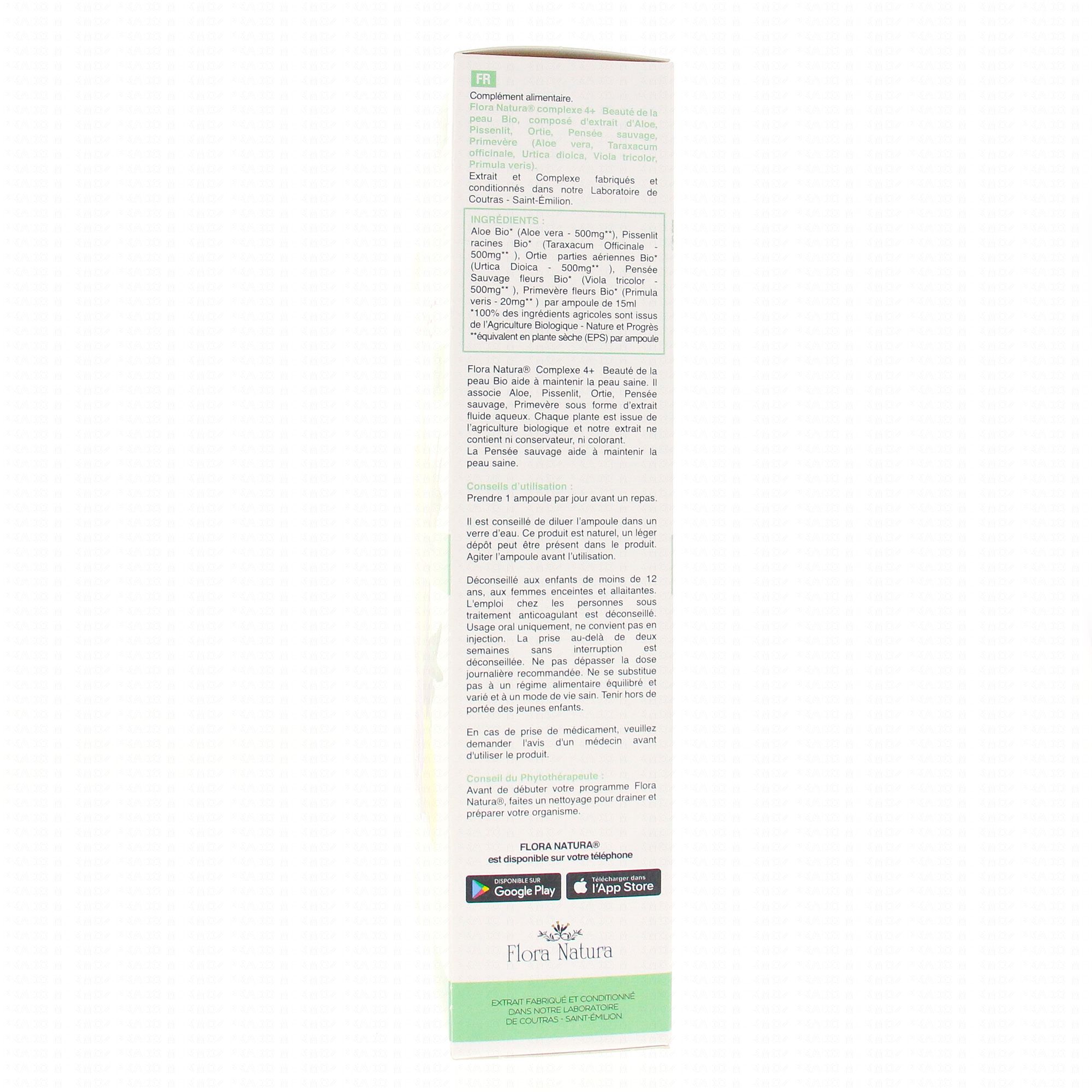 FLORA NATURA Complexe 4+ Beauté de la peau Bio 20 Ampoules de 15ml contient les éléments suivants :