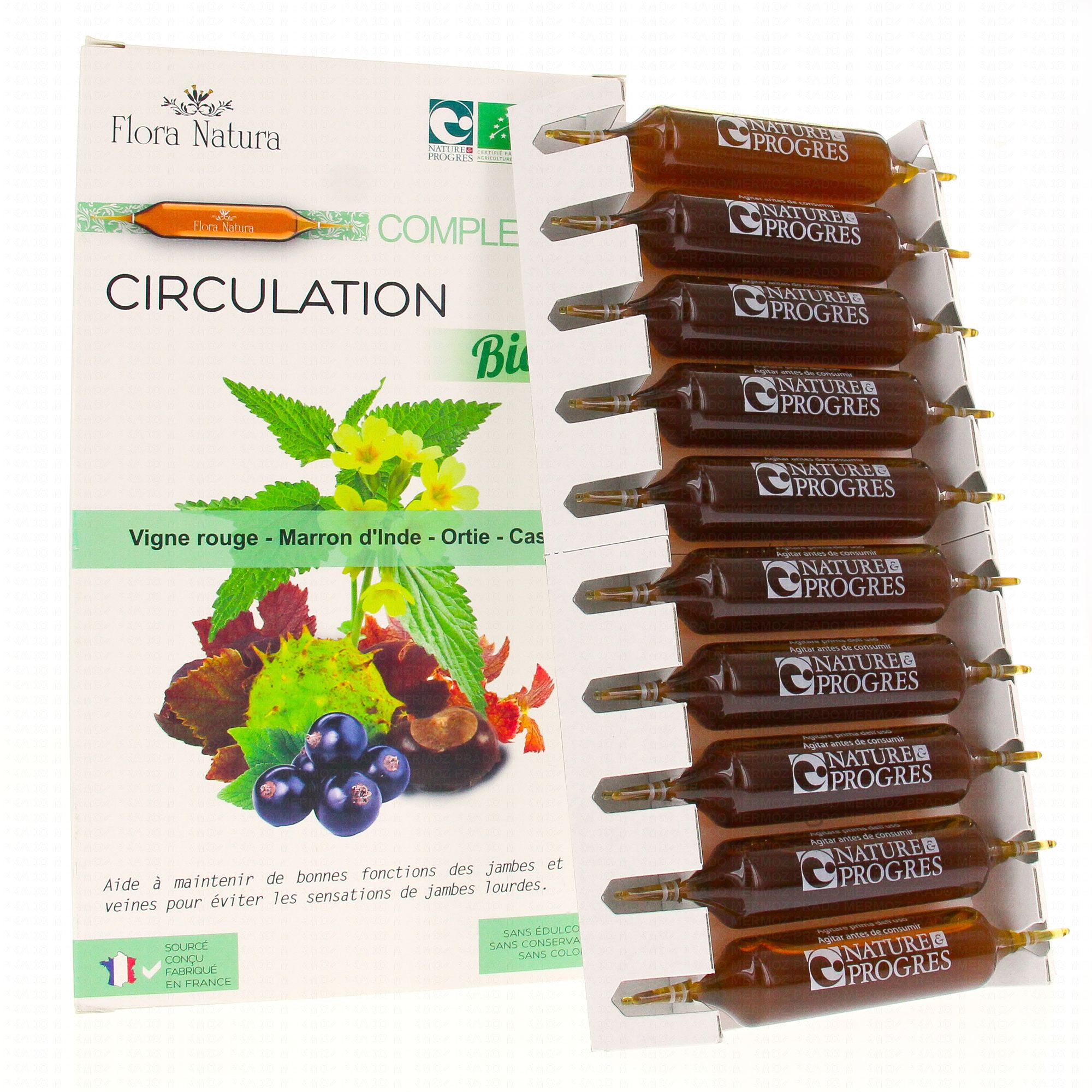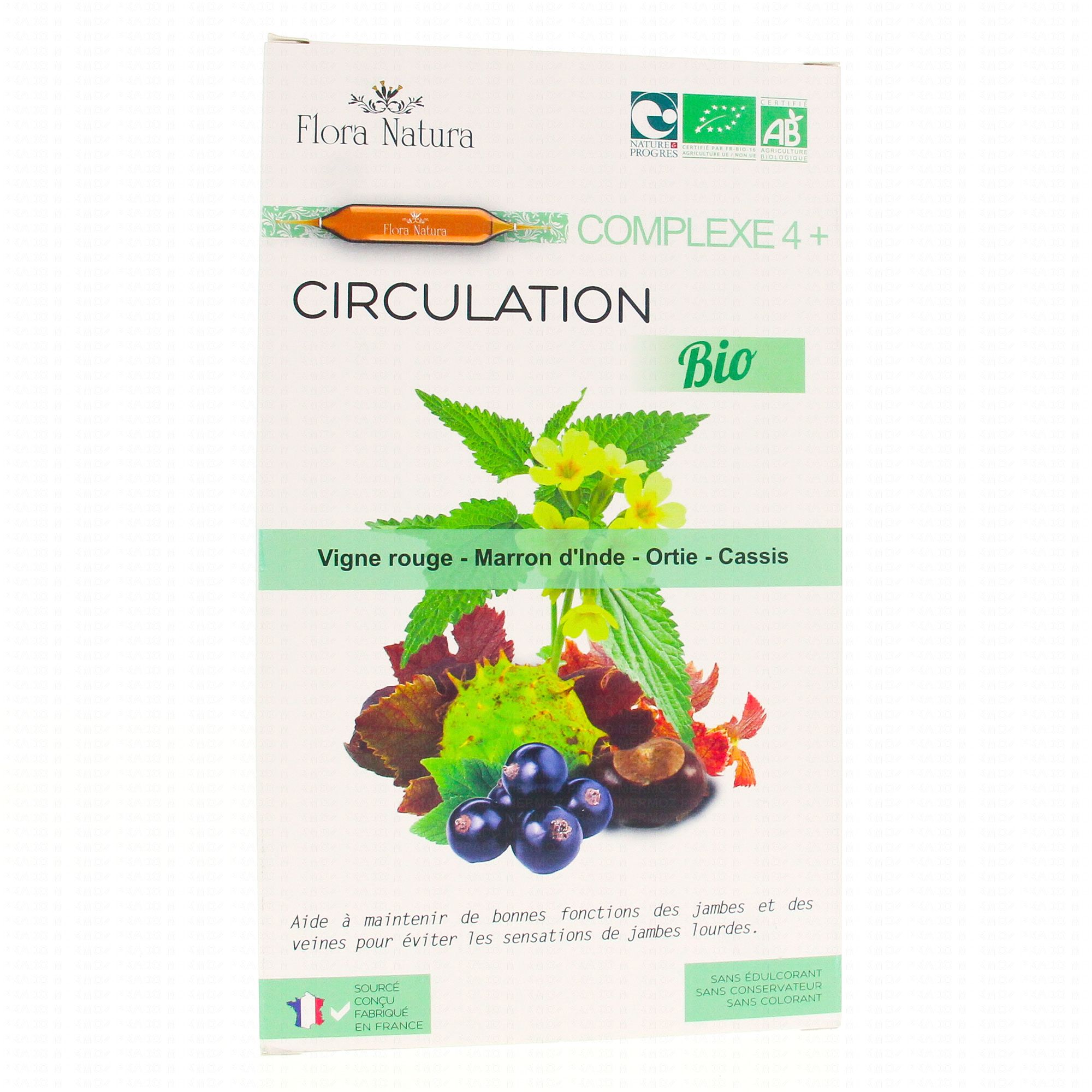 FLORA NATURA Complexe 4+ Circulation Bio 20 Ampoules de 15ml est un complément alimentaire qui soutient le bon fonctionnement du système circulatoire grâce à la présence de Cassis, de Vigne Rouge et de Marronnier d'Inde.