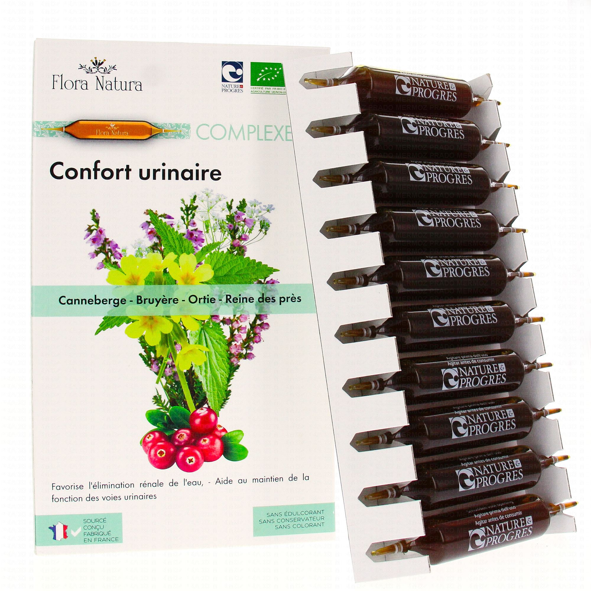 FLORA NATURA Complexe 4+ Confort Urinaire 20 Ampoules de 15ml est un complément alimentaire qui favorise les fonctions excrétrices du rein grâce à la présence de Bruyère, de Grande Ortie et de Reine des prés. La Canneberge contribue à inhiber la fixation de certaines bactéries E.coli dans les voies urinaires.