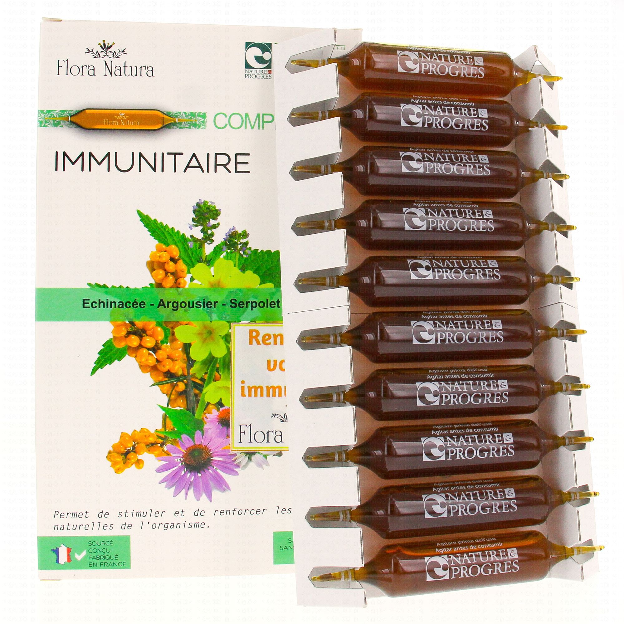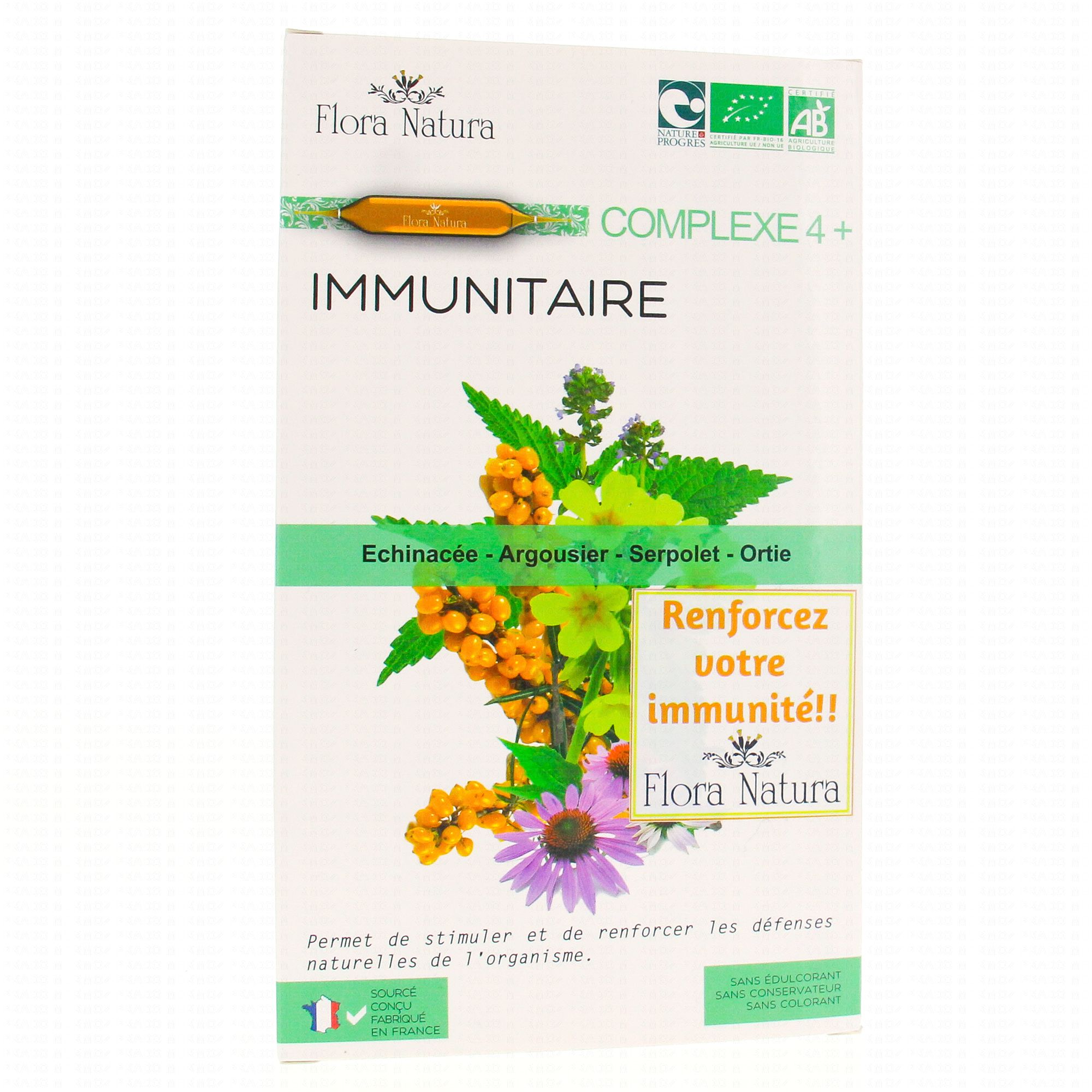 FLORA NATURA Complexe 4+ Immunitaire Bio 20 Ampoules de 15ml contient les éléments suivants :
