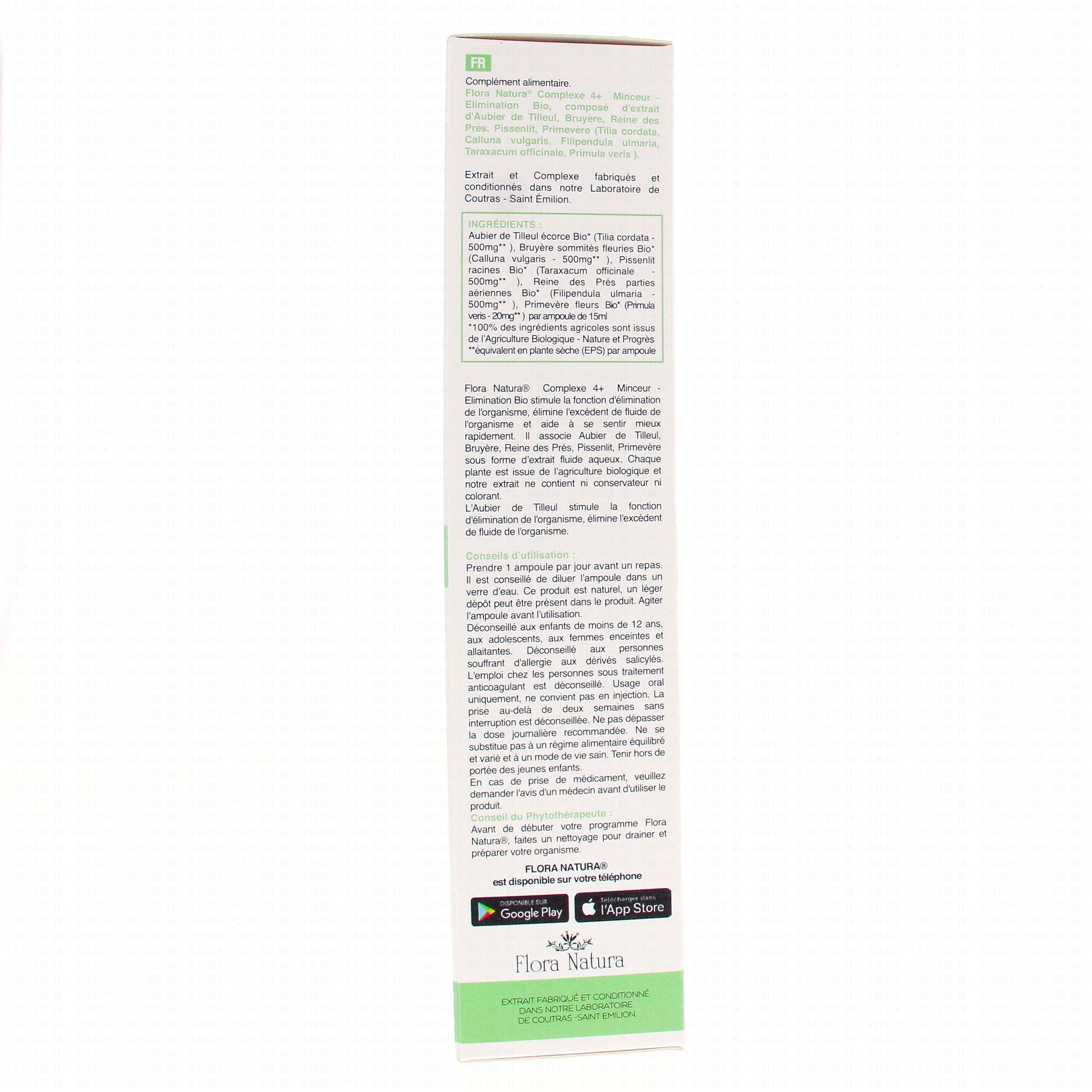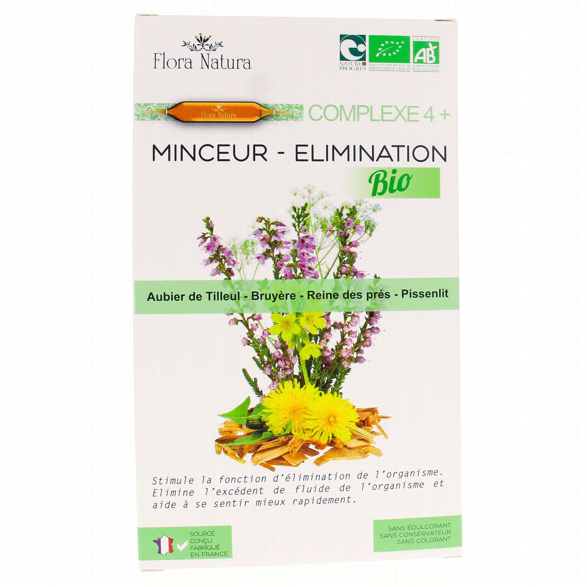 FLORA NATURA Complexe 4+ Minceur - Elimination Bio 20 Ampoules de 15ml contient les éléments suivants :