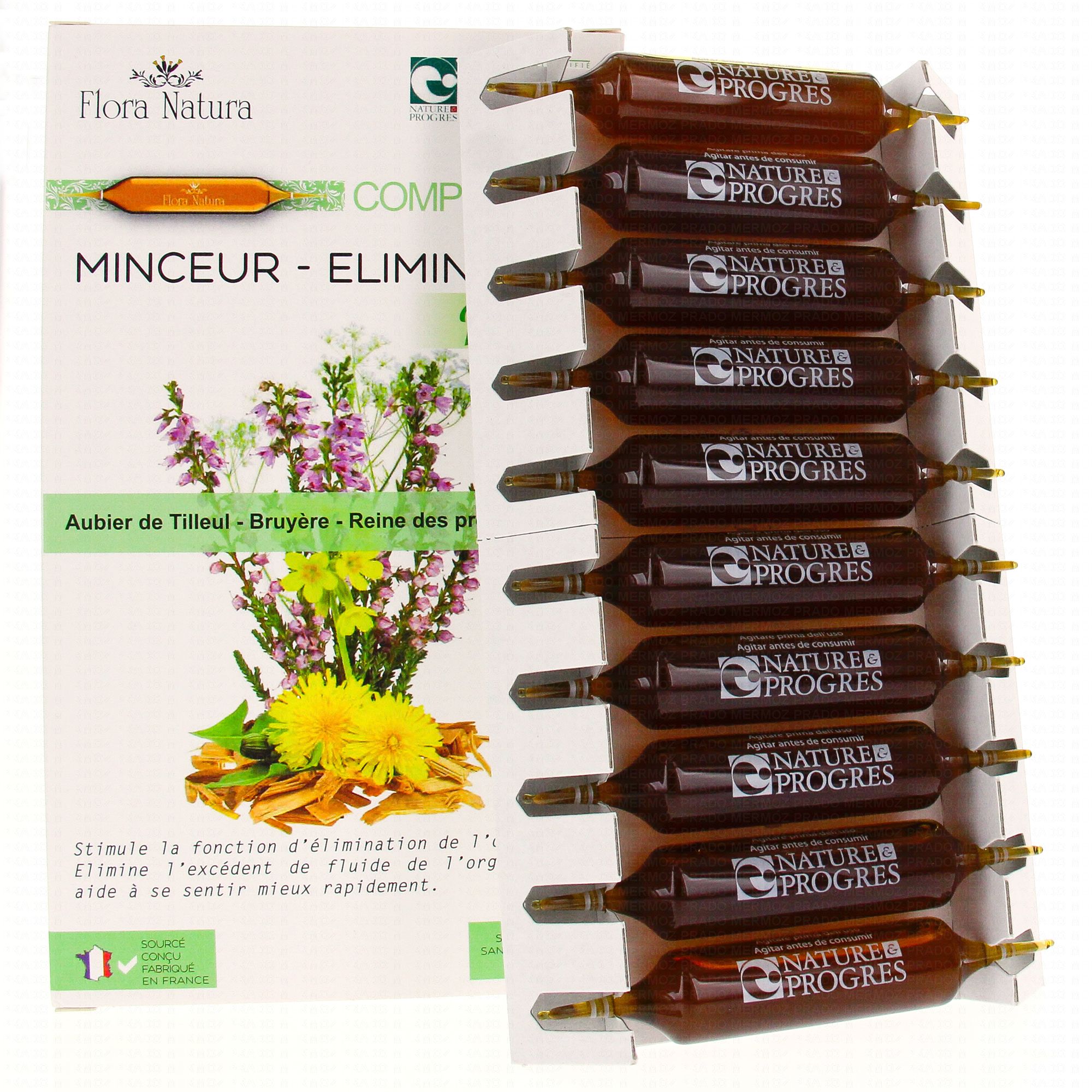FLORA NATURA Complexe 4+ Minceur - Elimination Bio 20 Ampoules de 15ml est un complément alimentaire qui contribue à favoriser les fonctions d'élimination grâce à la présence de Pissenlit, d'Aubier de tilleul, de Bruyère et de Reine des Prés. L'Aubier de Tilleul soutient la fonction hépatique et biliaire.
