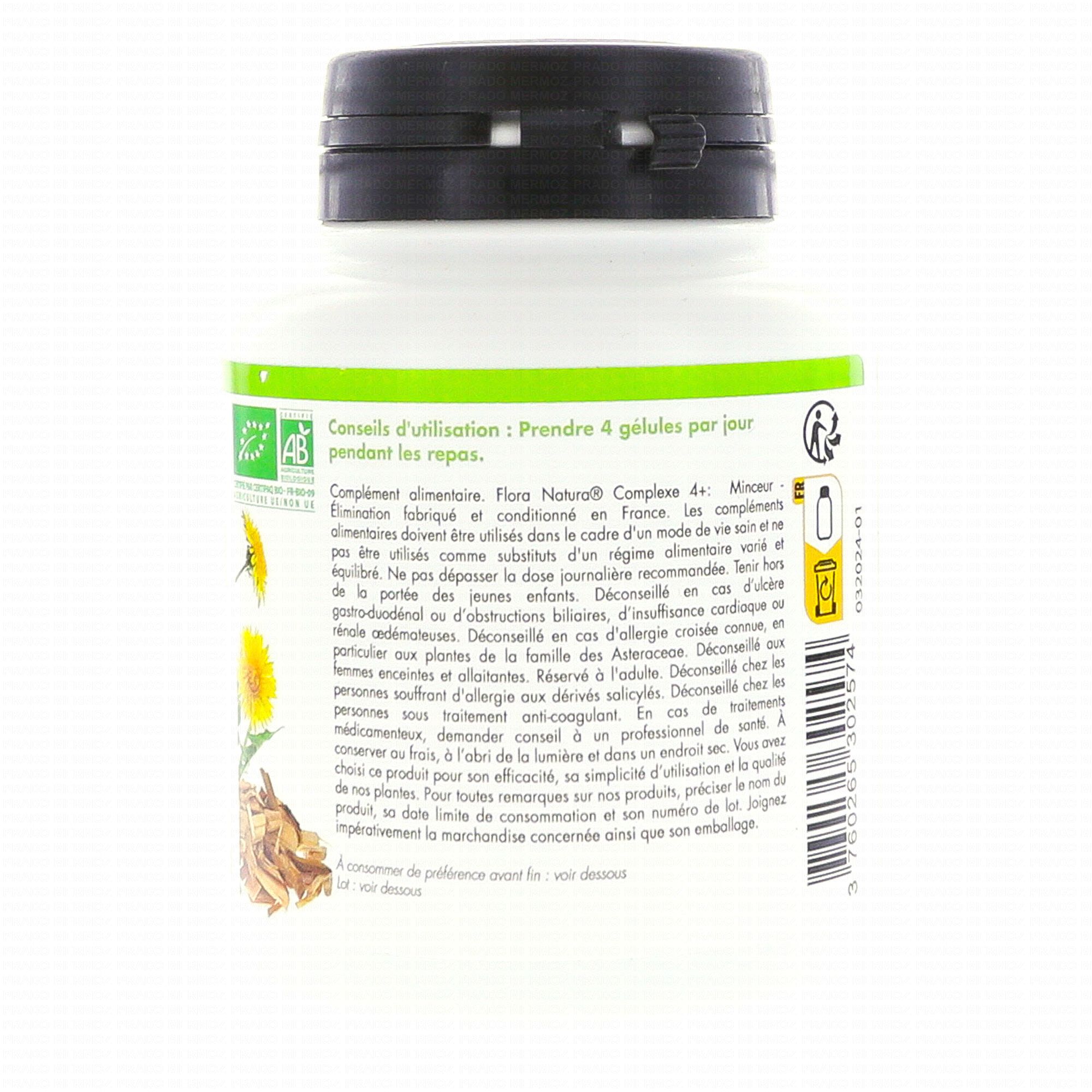 FLORA NATURA Complexe 4+ - Minceur Élimination bio x120 gélules contient les éléments suivants :