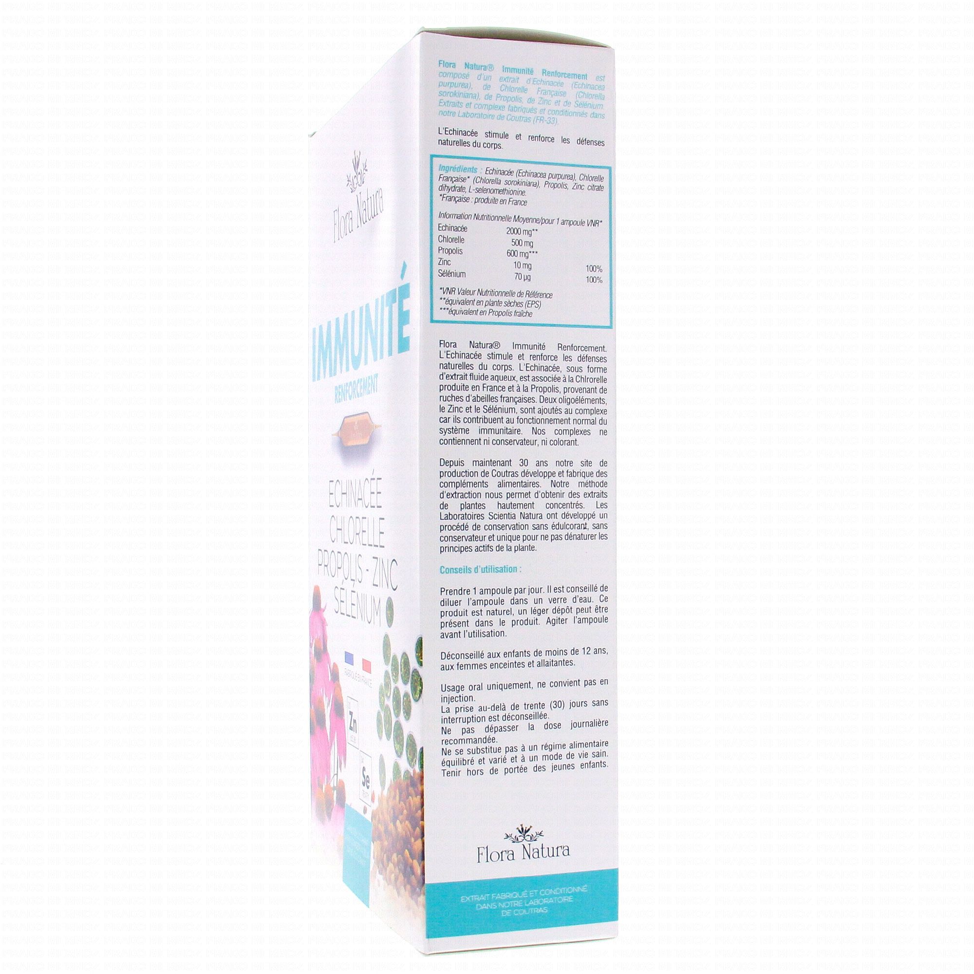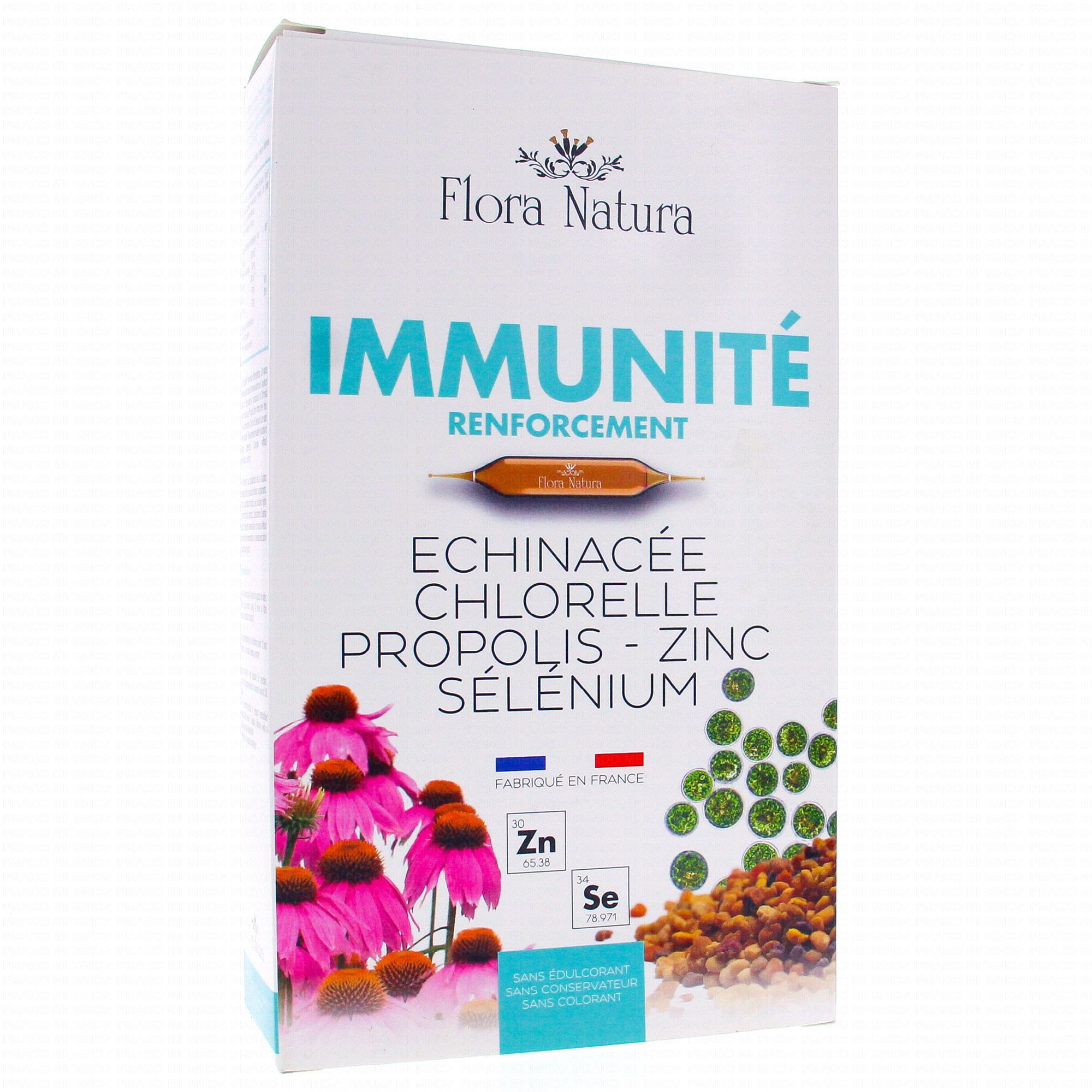 FLORA NATURA Immunité Renforcement boite de 20 ampoules est un complément alimentaire qui contribue à renforcer le système immunitaire grâce à la présence de Propolis, d'Echinacée, de Sélénium et de Zinc.