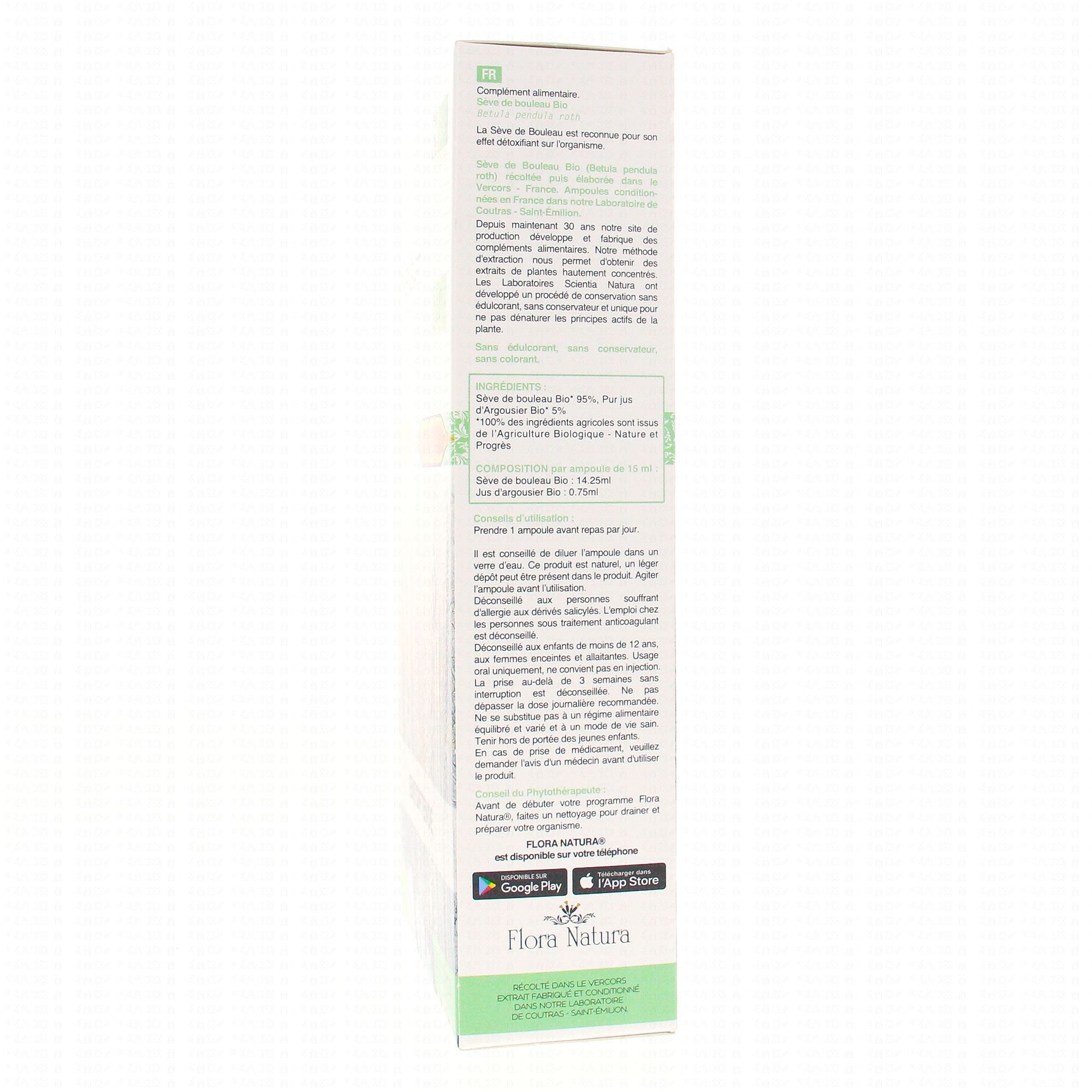 FLORA NATURA Sève de Bouleau Bio 20 Ampoules de 15ml contient les éléments suivants :
