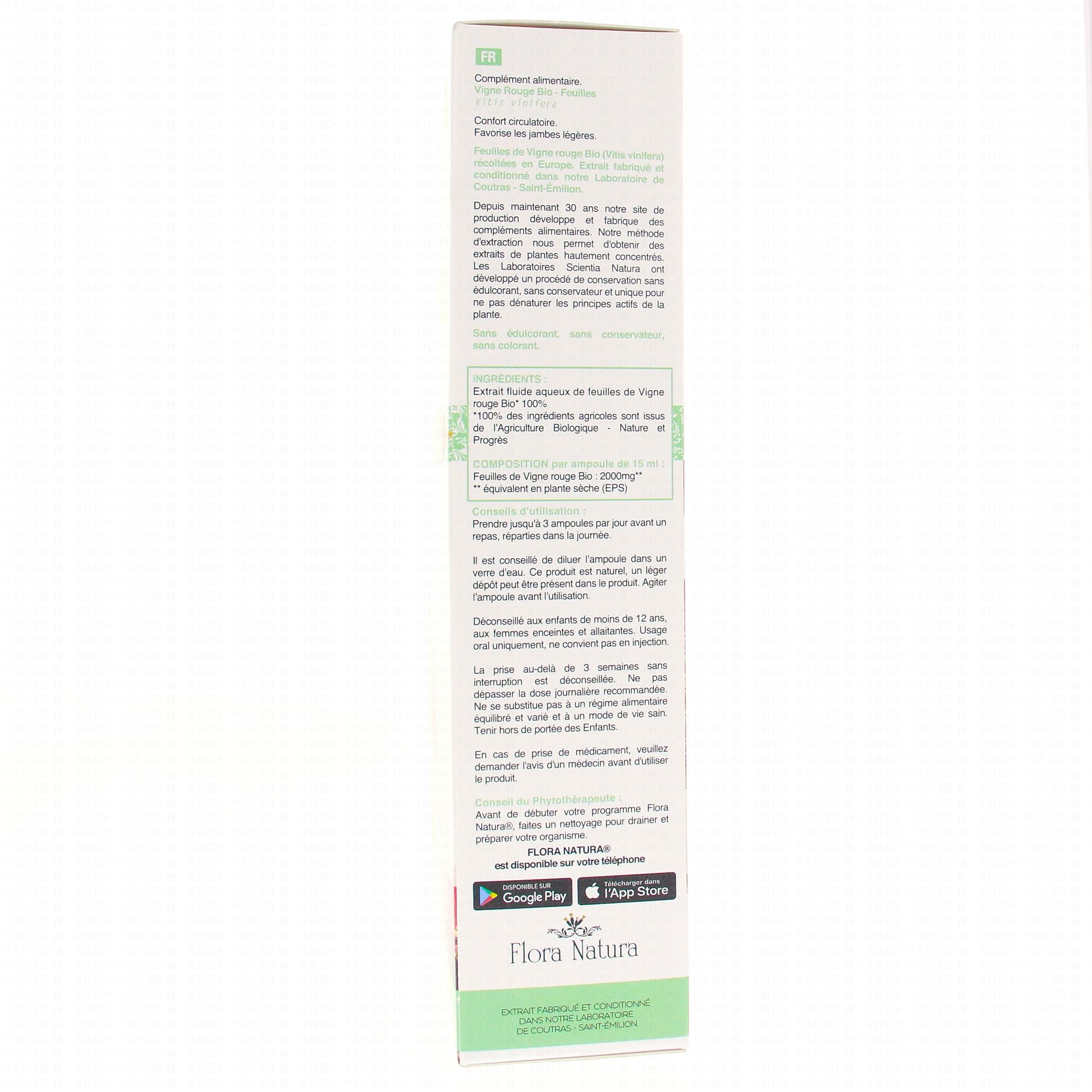 FLORA NATURA Vigne Rouge Bio 20 ampoules de 15ml contient les éléments suivants :