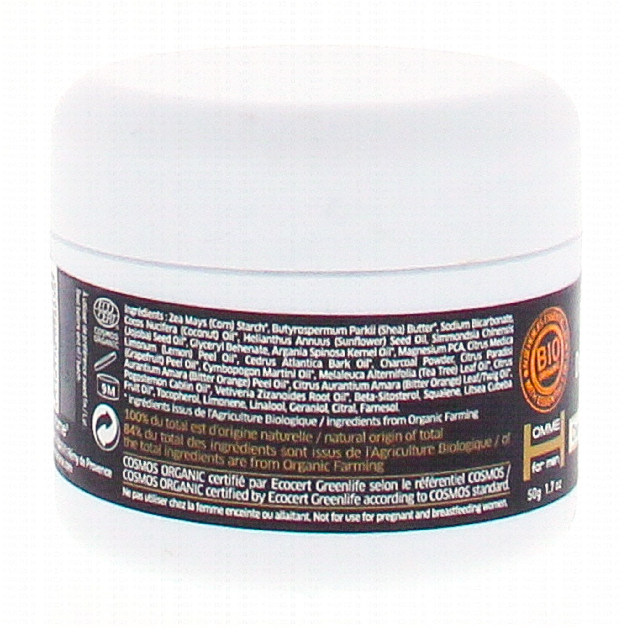 Zea Mays ( Starch*, Butyrospermum Parkii ( Butter*, Sodium Bicarbonate, Cocos Nucifera ( Oil*, Helianthus Annuus ( Seed Oil, Simmondsia Chinensis ( Seed Oil*, Glyceryl Behenate, Argania Spinosa Kernel Oil*, Magnesium PCA, Citrus Medica Limonum ( Peel Oil*, Cedrus Atlantica Bark Oil*, Charcoal Powder, Citrus Paradisi ( Peel Oil*, Cymbopogon Martini Oil*, Melaleuca Alternifolia (Tea Tree) Leaf Oil*, Citrus Aurantium Amara (Bitter Orange) Peel Oil*, Citrus Aurantium Amara (Bitter Orange) Leaf/Twig Oil*, Pogostemon Cablin Oil*, Vetiveria Zizanoides Root Oil*, Beta Sitosterol, Squalene, Litsea Cubeba Fruit Oil*, Tocopherol, Limonene, Linalool, Geraniol, Citral Farnesol