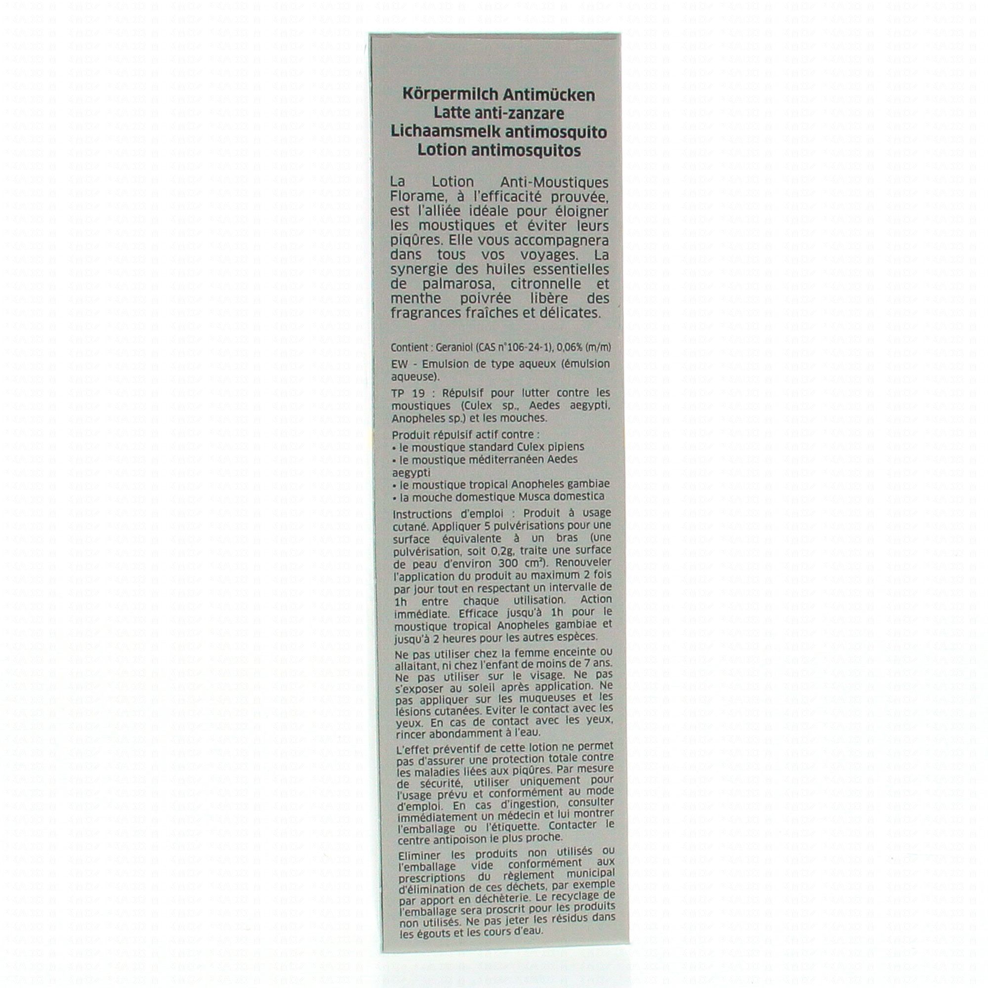 L'effet préventif de cette lotion ne permet pas d'assurer une protection totale contre les maladies liées aux piqûres. Par mesure de sécurité, utiliser uniquement pour l'usage prévu et conformément au mode d'emploi. En cas d'ingestion consulter immédiatement un médecin et lui montrer l'emballage ou l'étiquette. Contacter le centre antipoison le plus proche. Éliminer les produits non utilisés ou l'emballage vide conformément aux prescriptions du règlement municipal d'élimination de ces déchets, par exemple par apport en déchetterie. Le recyclage de l'emballage sera proscrit pour les produits non utilisés. Ne pas jeter les résidus dans les égouts et les cours d'eau.