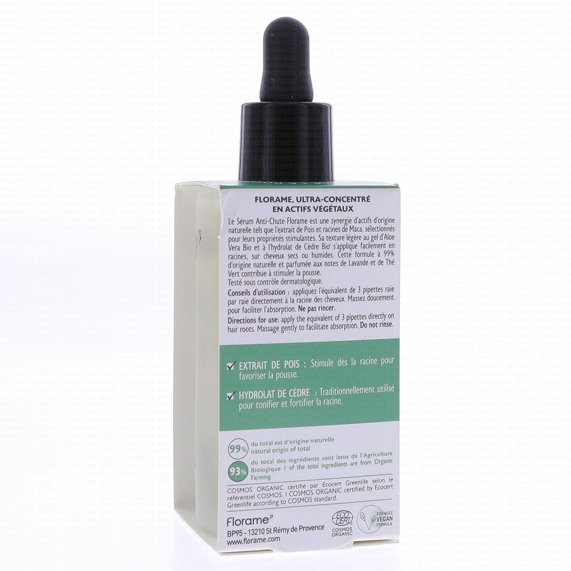 Le Sérum Anti-Chute Florame est un soin capillaire spécialement conçu pour aider à lutter contre la chute des cheveux. Il contient de l'extrait de pois cèdre bio, un ingrédient reconnu pour ses vertus stimulantes et régénérantes qui aident à revitaliser le cuir chevelu. Il favorise la circulation sanguine au niveau du follicule pileux et aide à renforcer la racine des cheveux, contribuant ainsi à réduire la chute. Ce sérum vise à renforcer la fibre capillaire et favoriser la croissance des cheveux.