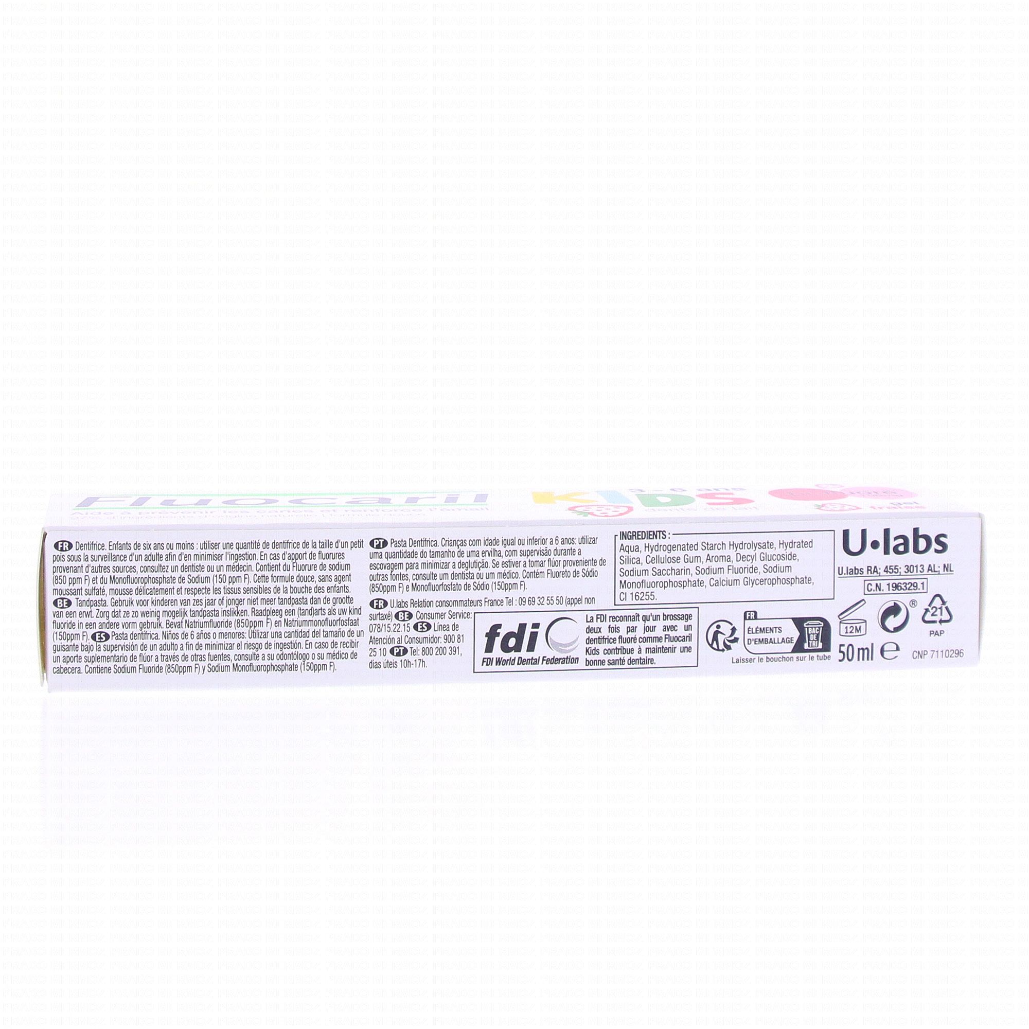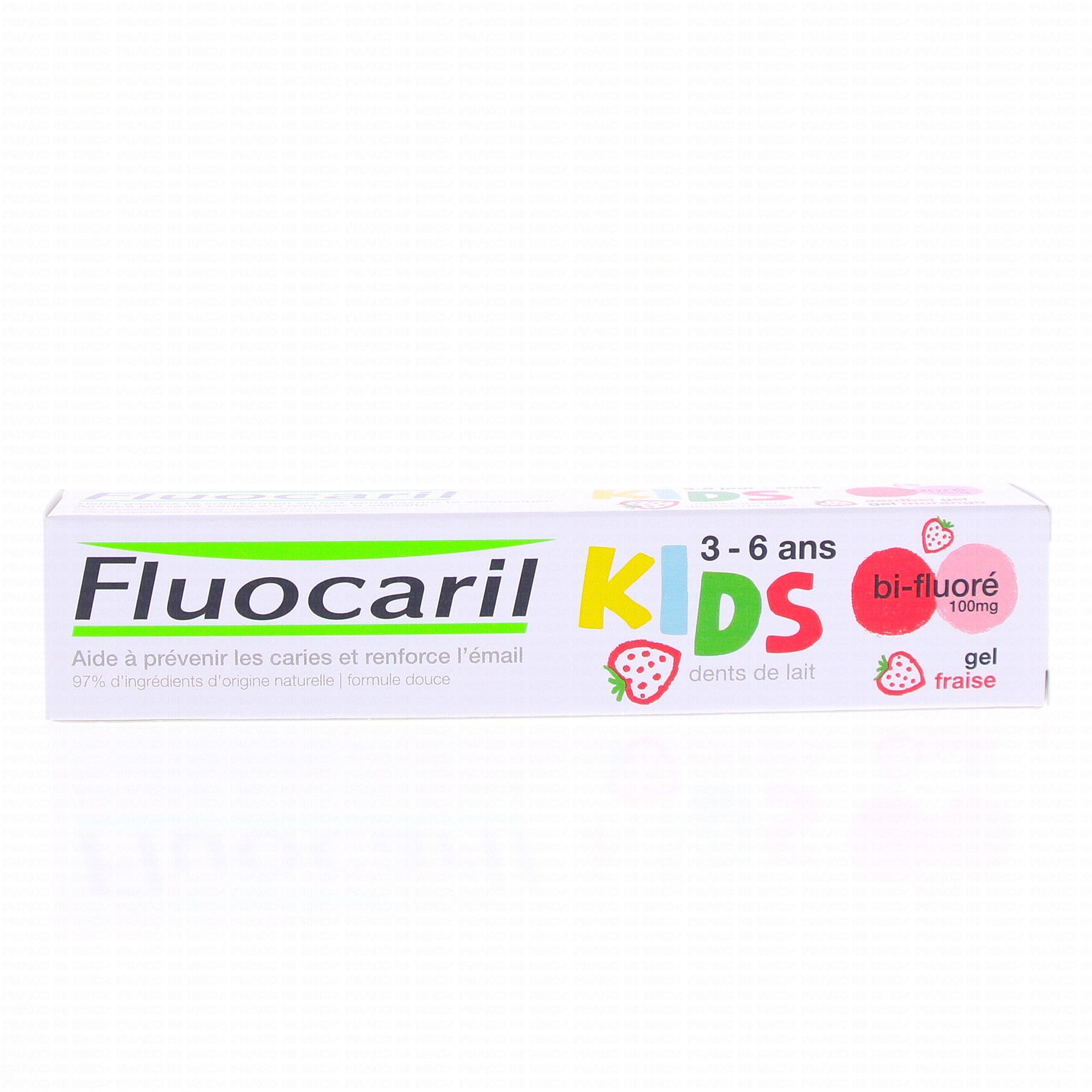 Le dentifrice Fluocaril Kids 100mg est idéal pour le soin des premières dents de lait. Spécialement conçu pour les enfants de 3 à 6 ans et vendu exclusivement en pharmacie, il aide à prévenir les caries, renforce l'émail et respecte les gencives de votre enfant. Avec 97% d'ingrédients d'origine naturelle.