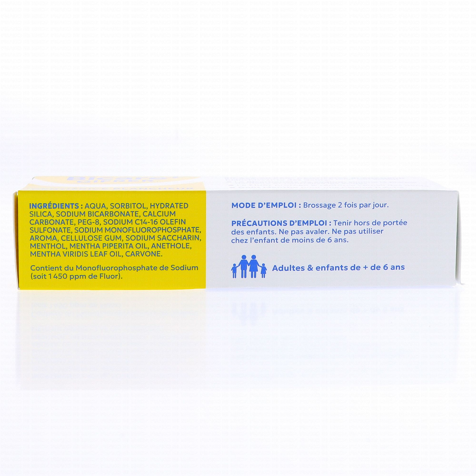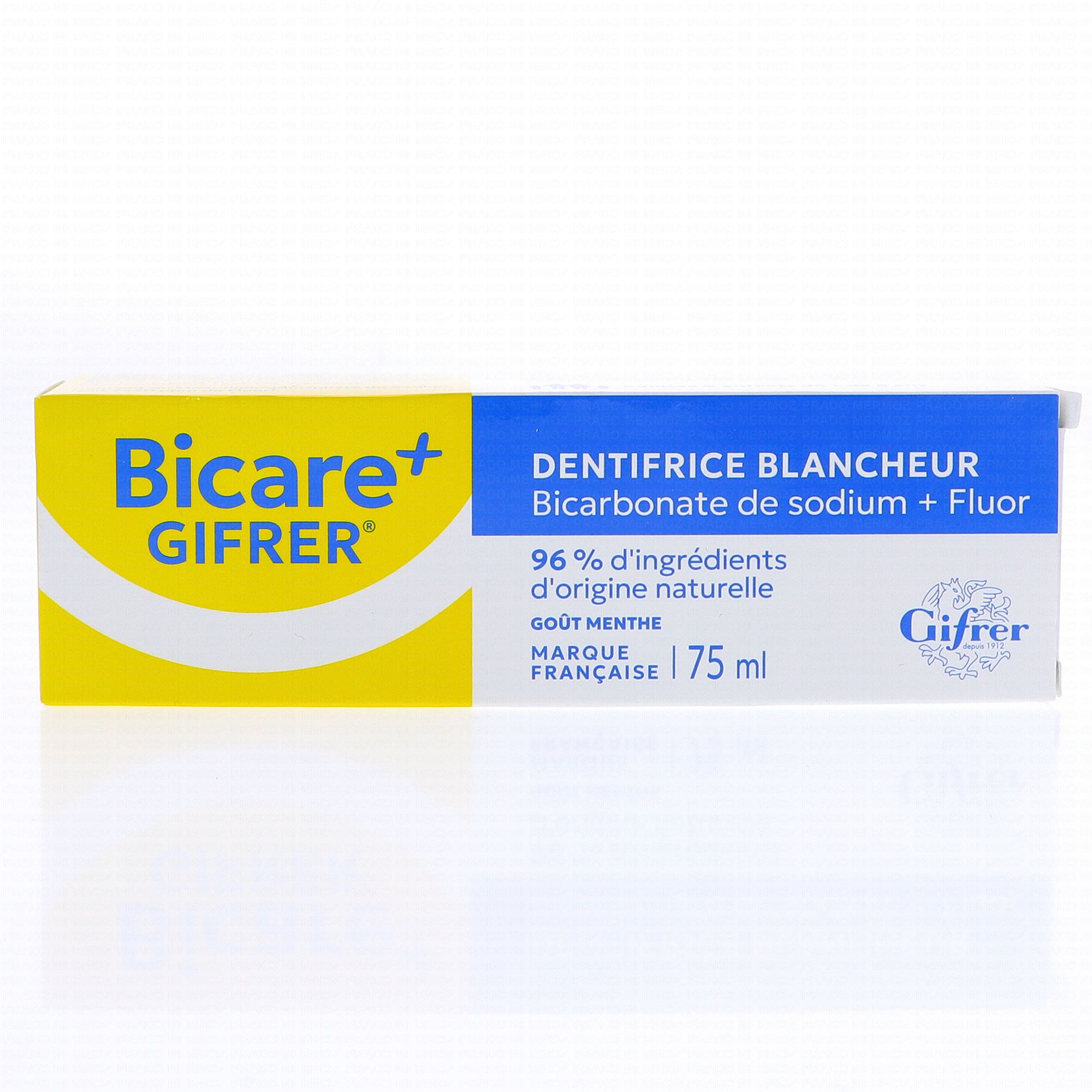 À la bicarbonate de soude et au fluor, le dentifrice Bicare Plus aide à réduire les colorations installées sur les dents dans le temps (tabac, café, thé...) tout en les renforçant au fil des brossages. Goût frais.