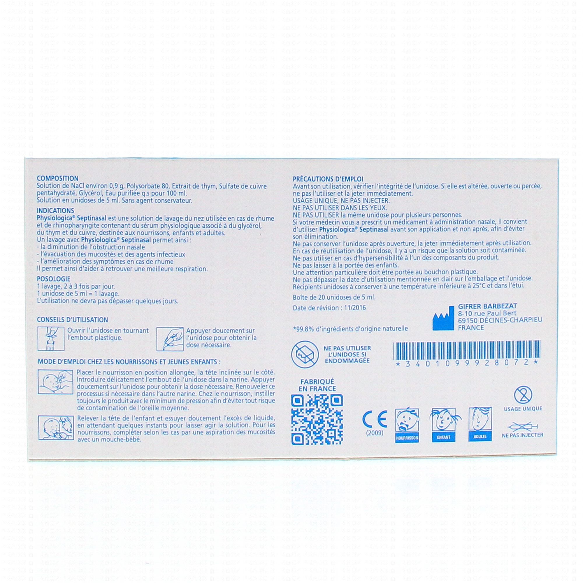Physiologica Septinasal est une solution de lavage du nez utilisée en cas de rhume et de rhinopharyngite contenant un fluidifiant, du thym (connu pour ses propriétés antibactériennes) et du cuivre.