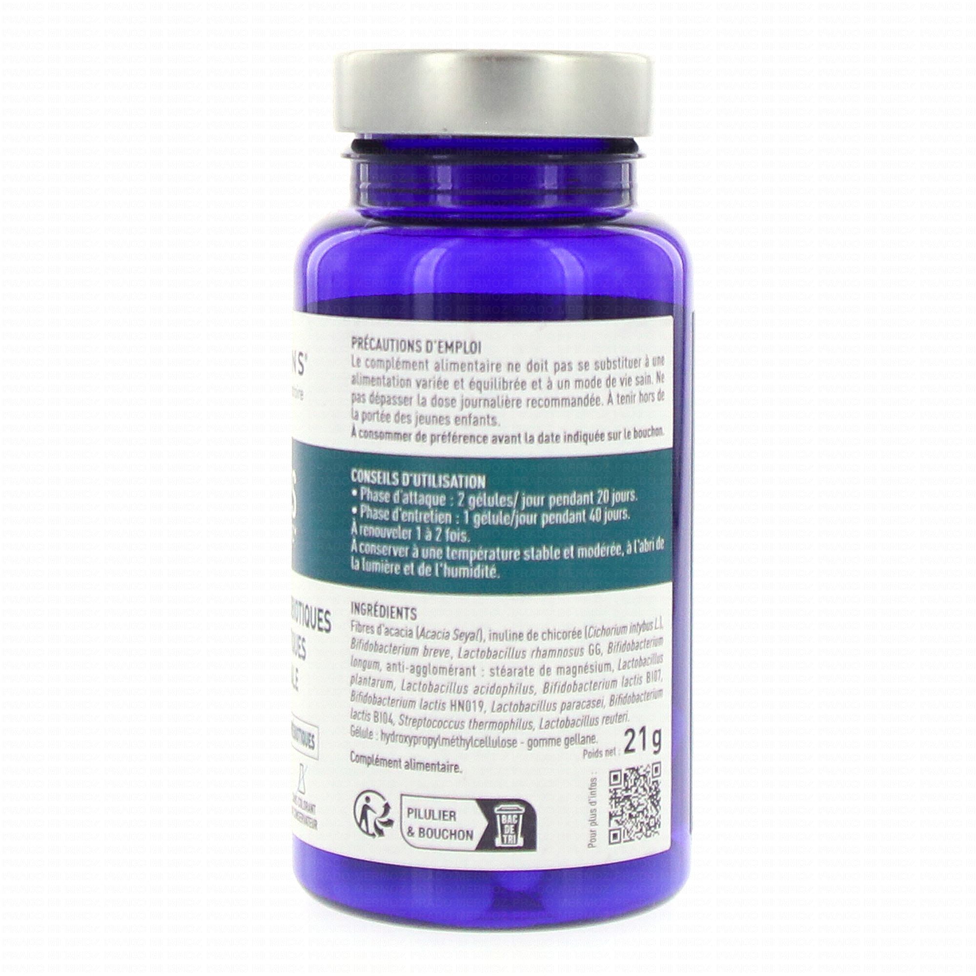 Fibres d'acacia (Acacia Seyal), inuline de chicorée (Cichorium intybus L.), Bifidobacterium breve, Lactobacillus rhamnosus GG, Bifidobacterium longum, anti-agglomérant : stéarate de magnésium, Lactobacillus plantarum, Lactobacillus acidophilus, Bifidobacterium lactis B107, Bifidobacterium lactis HN019, Lactobacillus paracasei, Bifidobacterium lactis B104, Streptococcus thermophilus, Lactobacillus reuteri.