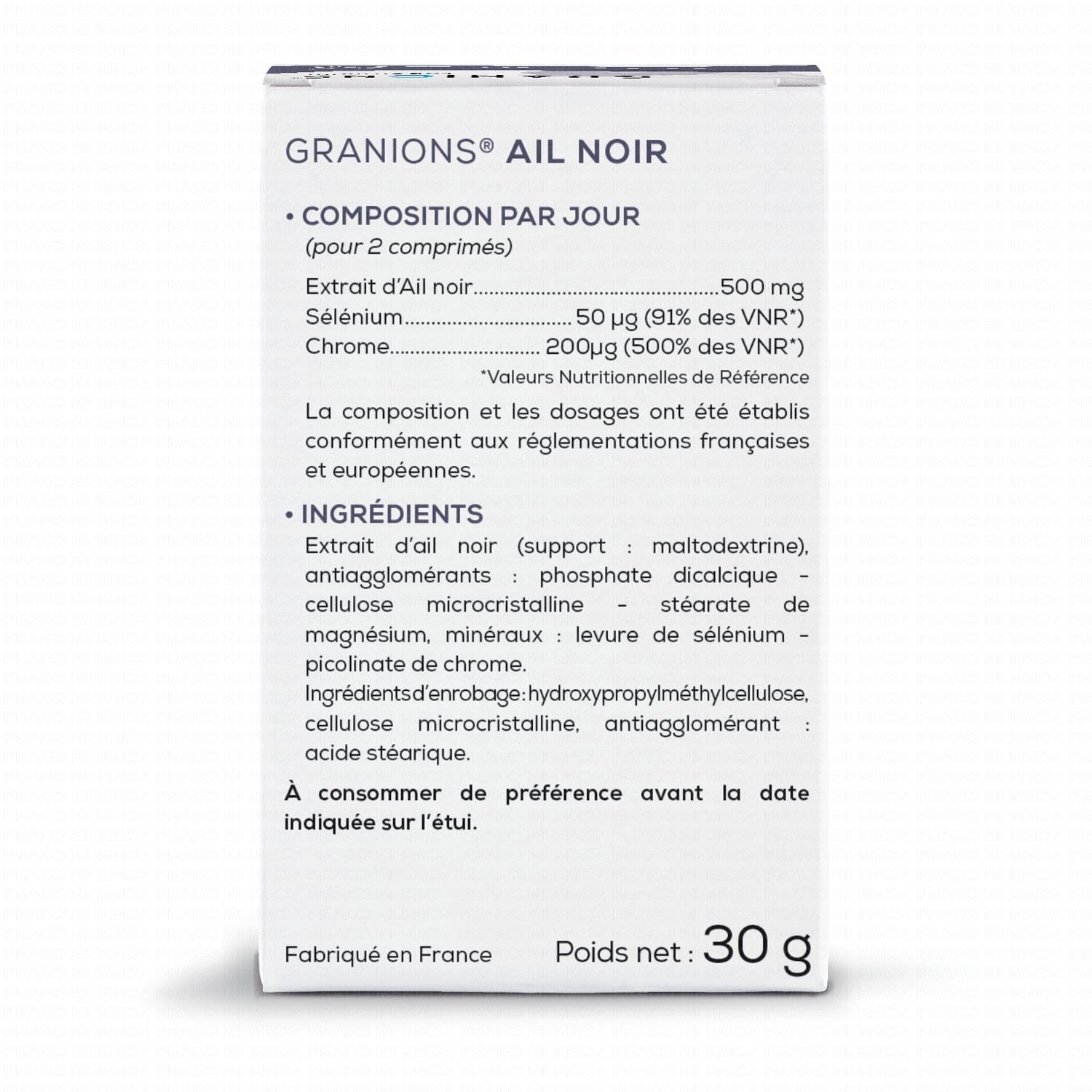 Composition par jour ( pour 2 comprimés): extrait d'ail noir 500mg ; sélénium 50µg (91% des VNR*) ; chrome 200µg (500% des VNR*)