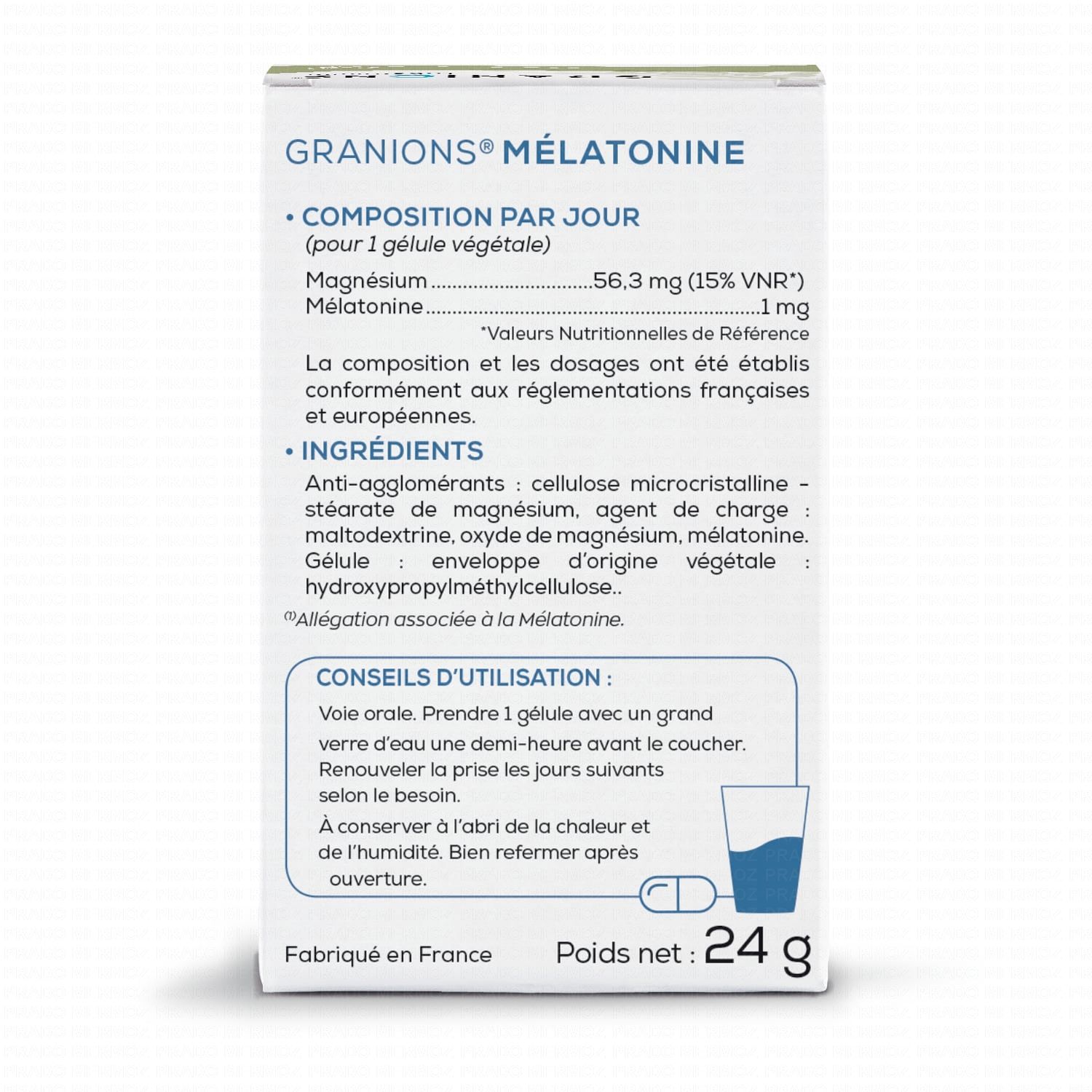 GRANIONS Melatonine 1mg 60 gélules contient les éléments suivants :