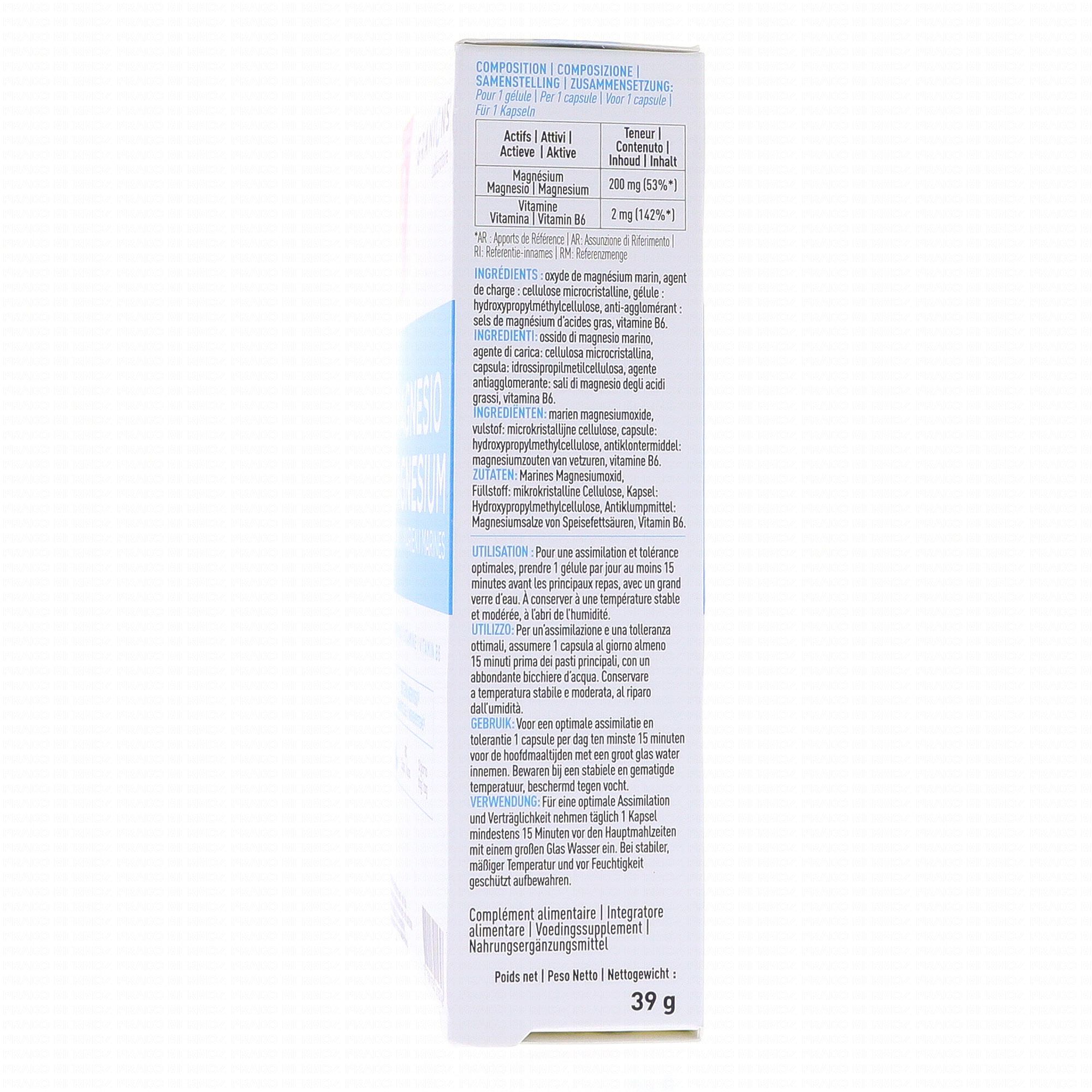 Oxyde de magnésium d'origine marine, Enveloppe d'origine végétale : Hydroxypropylméthylcellulose, Agent de charge : Cellulose microcristalline, Anti-agglomérants : Carbonate de magnésium, Stéarate de magnésium ; Vitamine B6 (Chlorhydrate de pyridoxine).