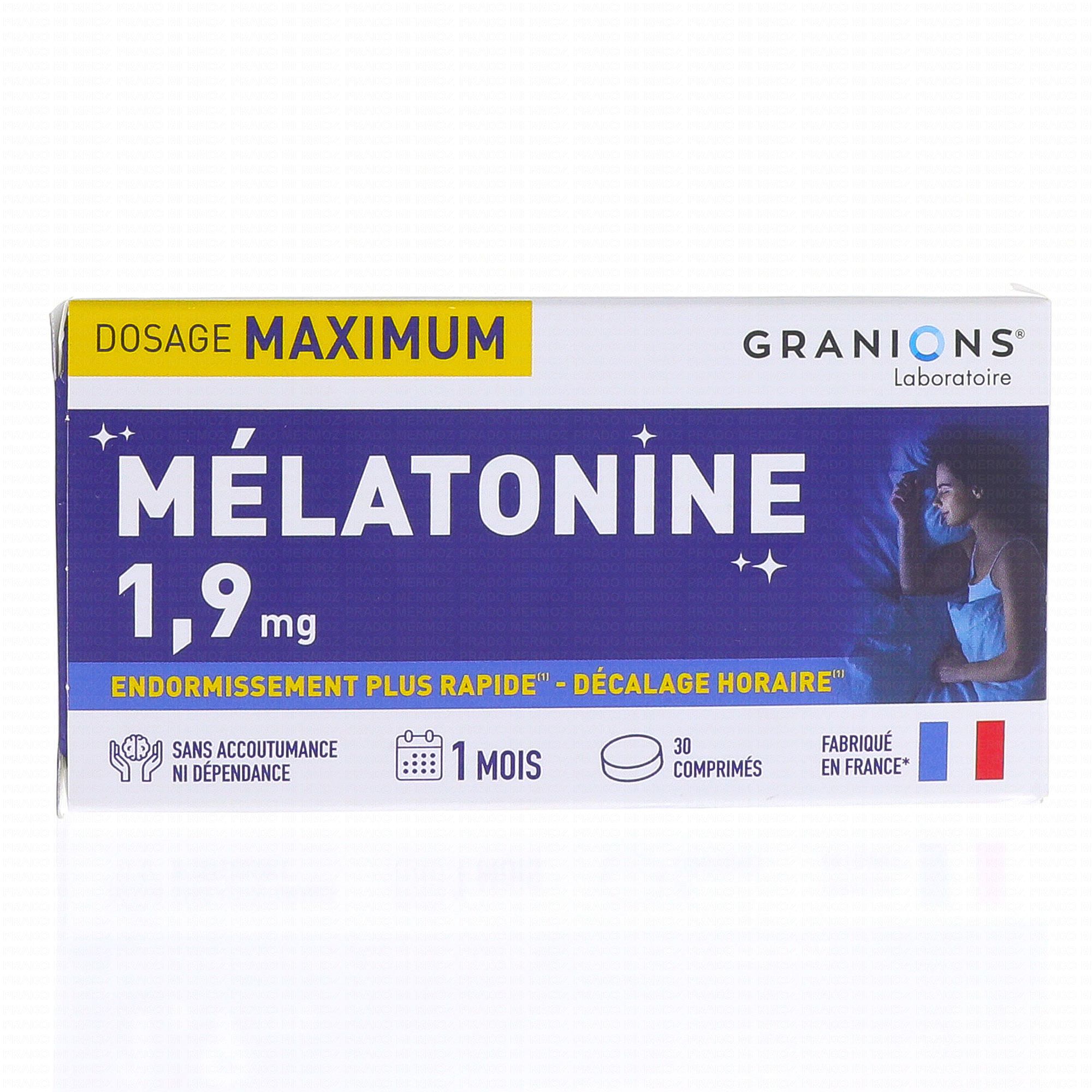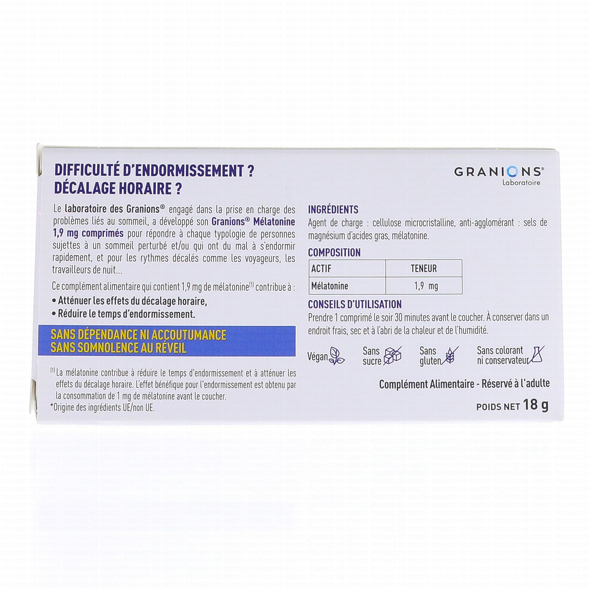 GRANIONS Mélatonine 1.9mg boite de 30 comprimés est un complément alimentaire qui contribue à réduire le temps d'endormissement et à atténuer les effets du décalage horaire grâce à la présence de Mélatonine.