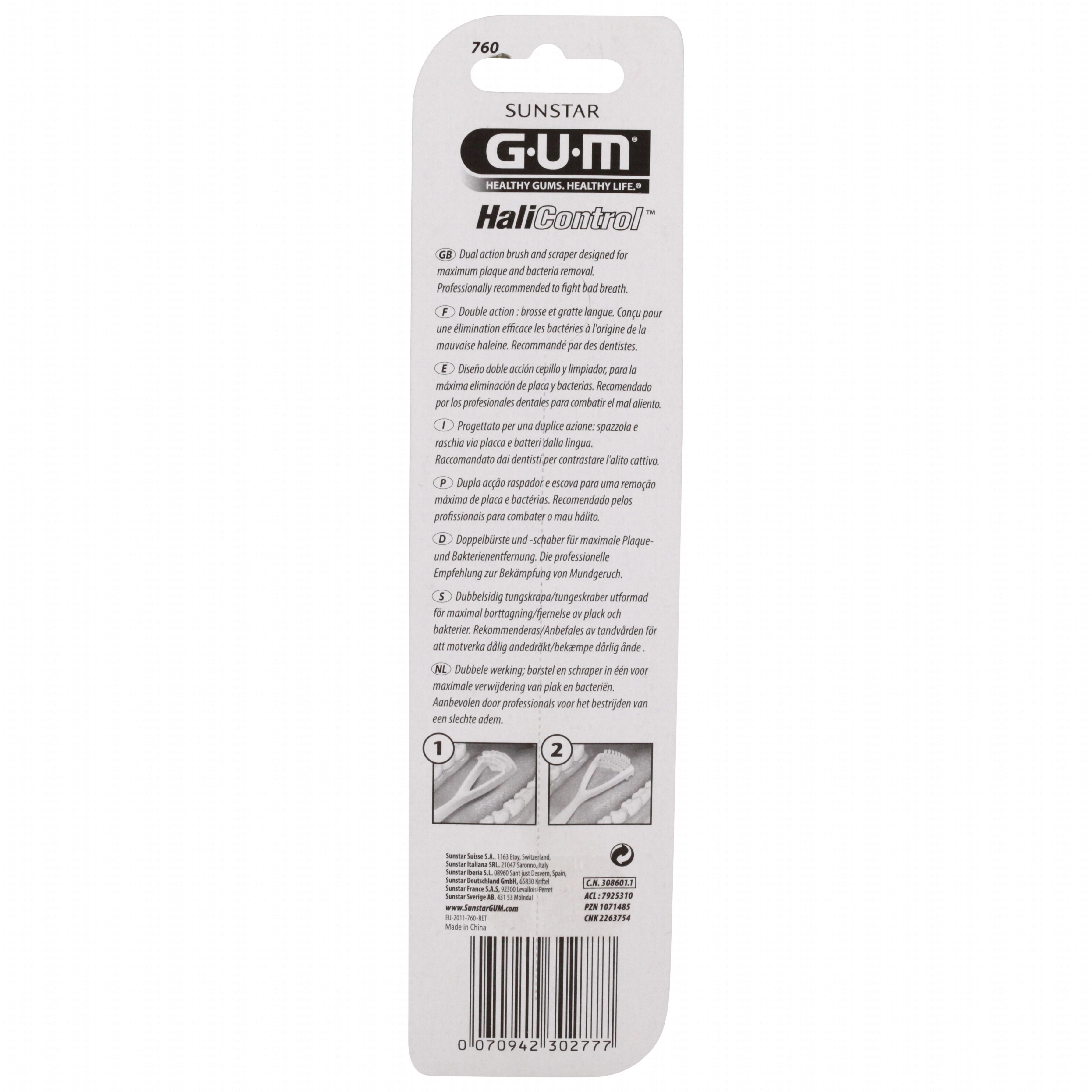 Le gratte-langue Gum est conseillé par des professionnels afin de maintenir une bonne hygiène bucco-dentaire. Il possède un coté qui permet de gratter et un autre pour brosser. Tête triangulaire évidée, muni d'un côté pour gratter et d'un autre pour brosser. Manche ergonomique avec butée de préhension. Coloris : blanc et bordeaux, blanc et bleu foncé. Conditionnement : carte blister.