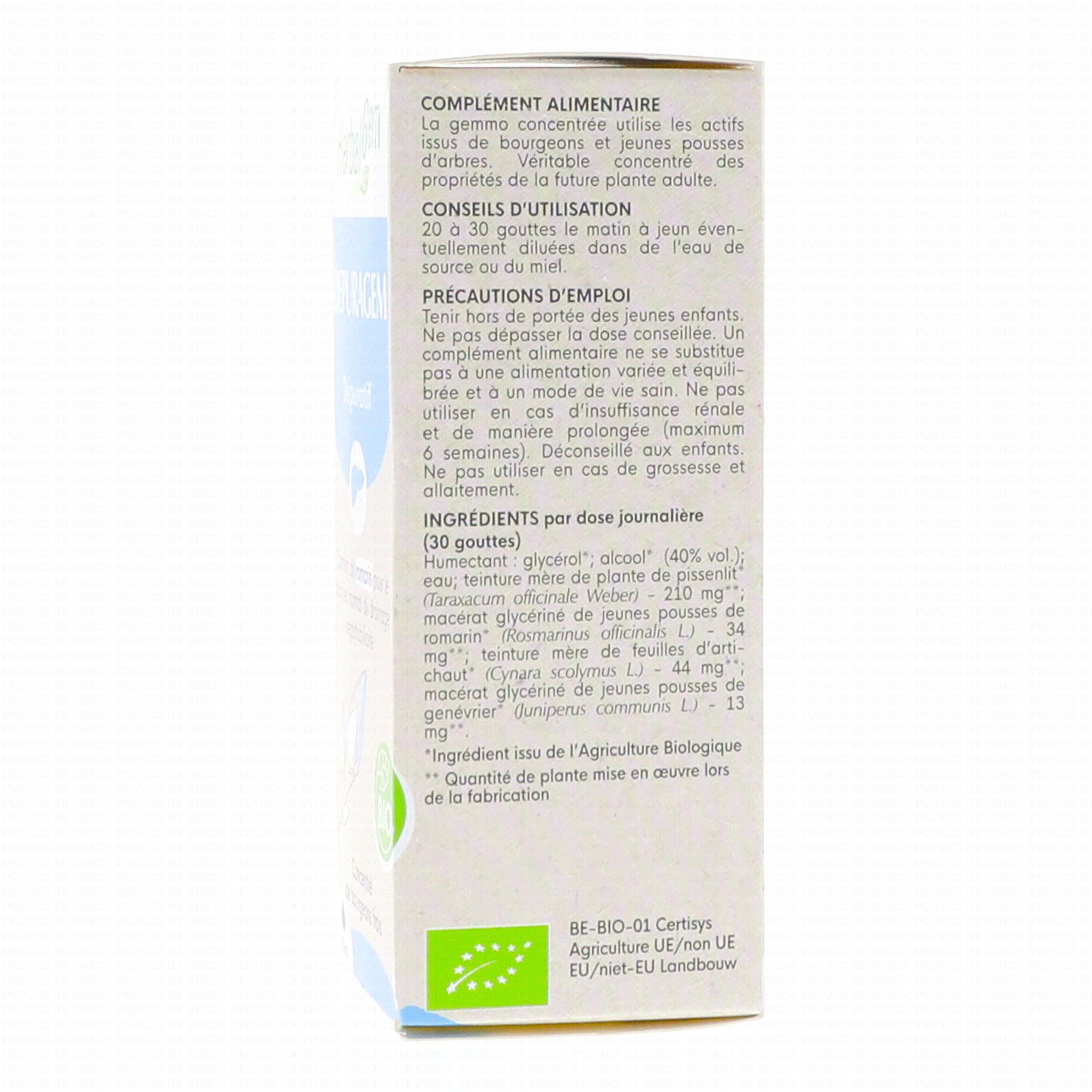 Complexe de gemmothérapie : Bourgeons de Romarin, Bourgeon de Genévrier, des extraits de Pissenlit et d'Artichaut.