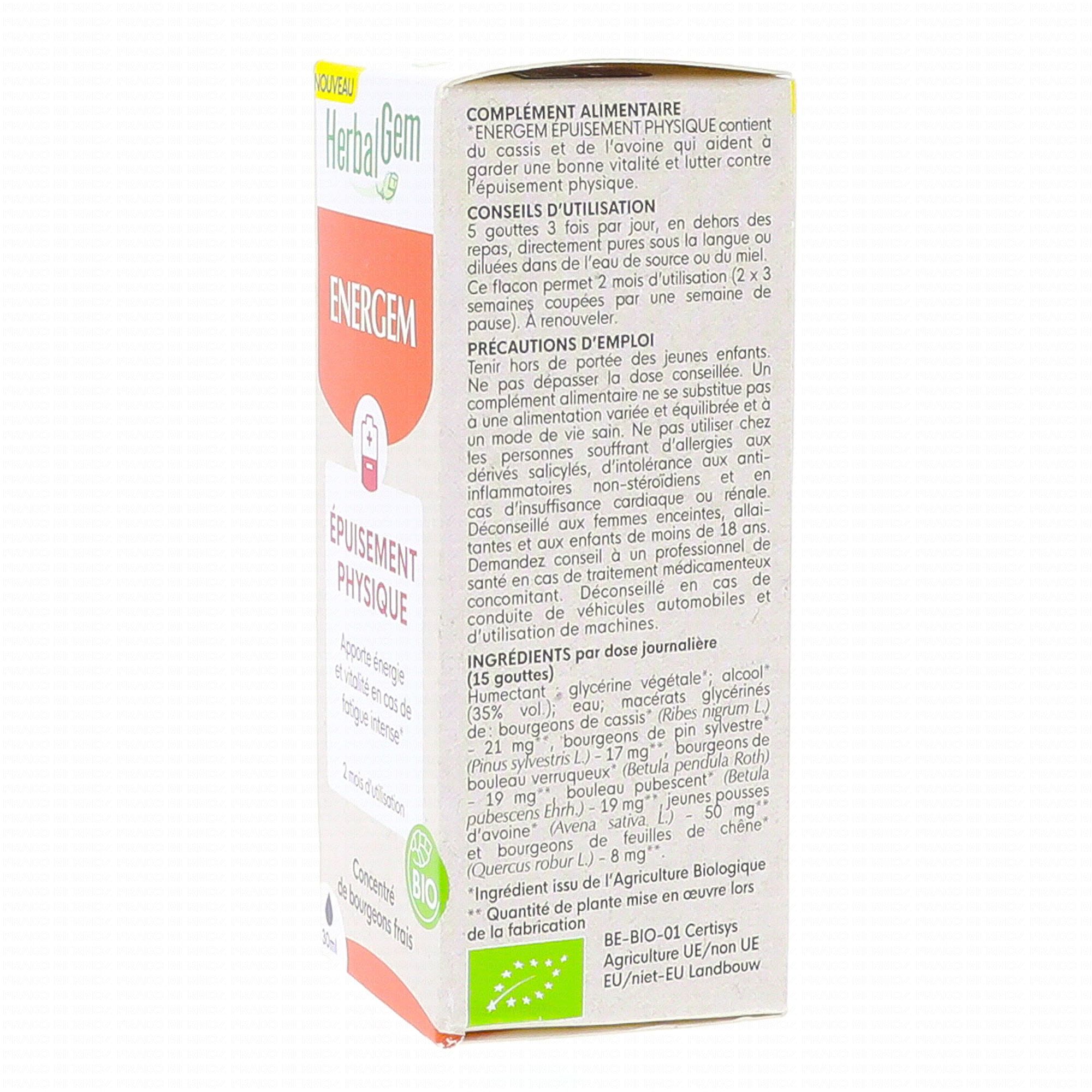 HERBALGEM Concentré de bourgeons frais - Energem Epuisement Physique Bio 30ml est un complexe synérgique de bourgeons formulé pour aider à retrouver énergie et vitalité durablement.