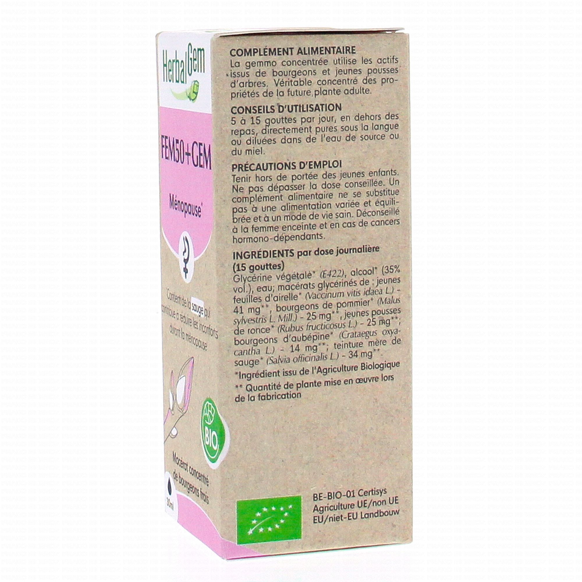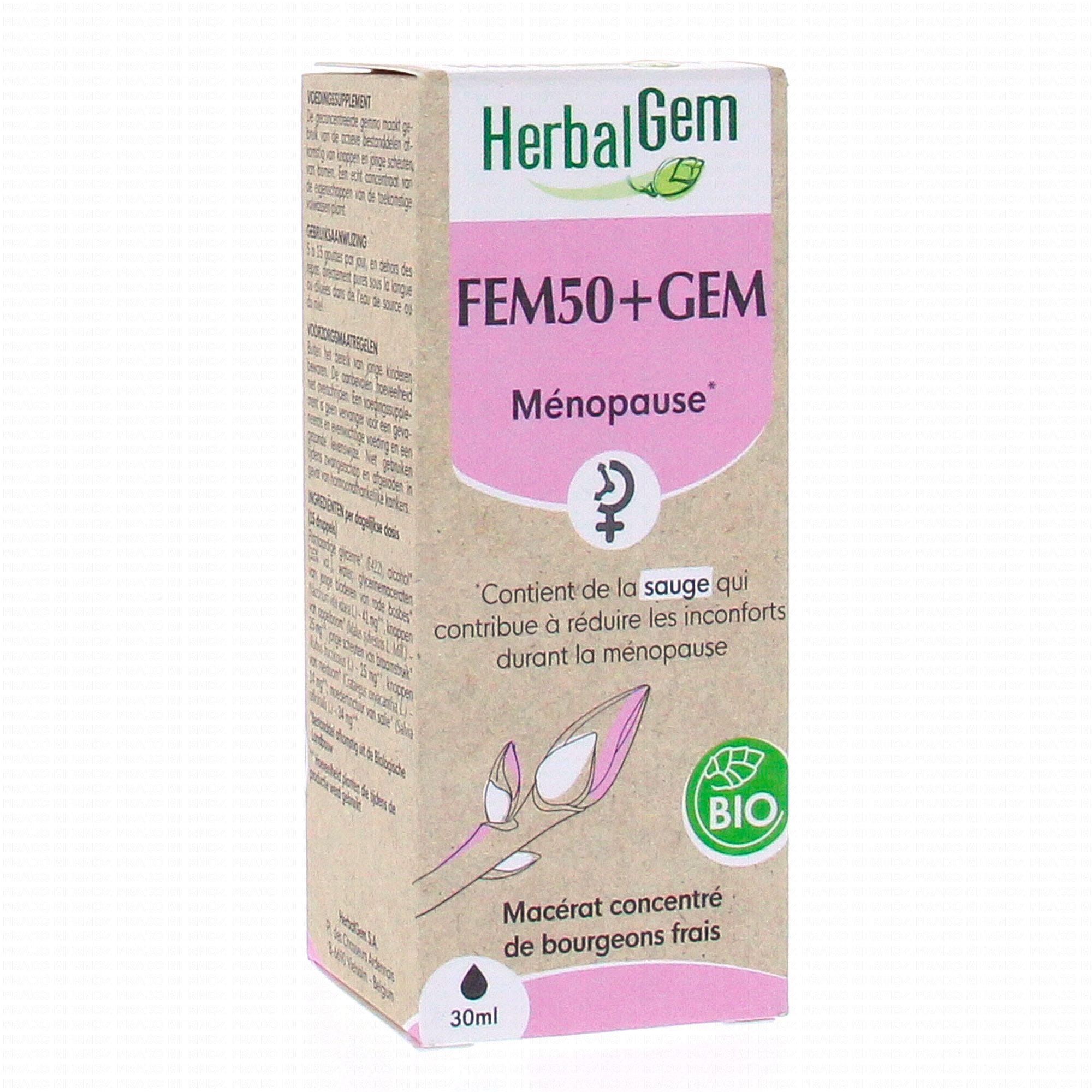 HERBALGEM Concentré de bourgeons frais - Fem50 +Gem Ménopause Bio 30ml est un complexe de gemmothérapie pour accompagne la femme entre 45 et 55 ans pendant sa ménopause et permet de rééquilibrer le taux hormonal.