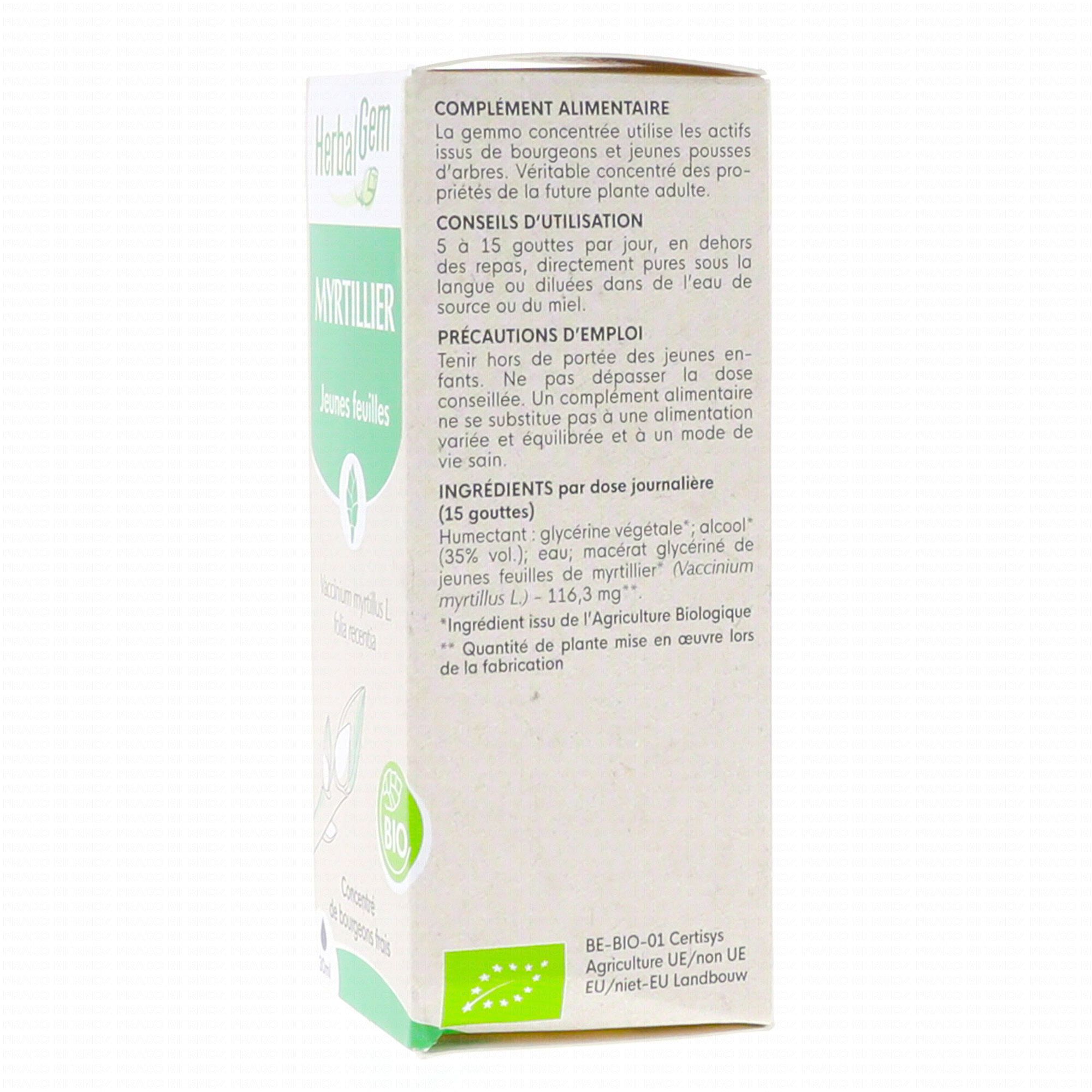 HERBALGEM Concentré du bourgeons frais - Myrtillier jeunes feuilles Bio 30ml contient les éléments suivants :