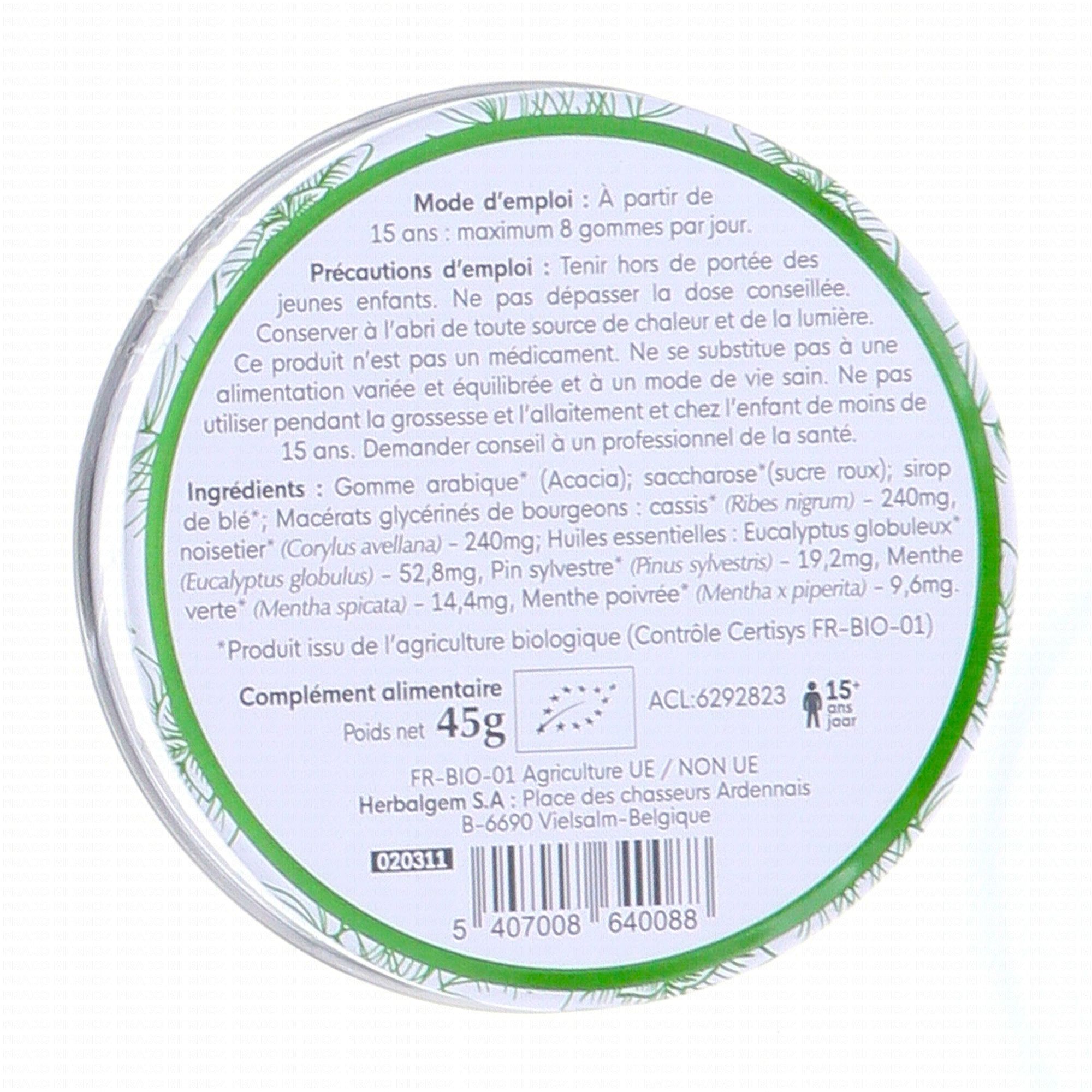 En stockHERBALGEM Gommes Gorge Fumeurs Bio contiennent des extraits de macérat de bourgeons de cassis et de noisetier, ainsi que des huiles essentielles d'eucalyptus globulus, de pin sylvestre, de menthe verte et de menthe poivrée.