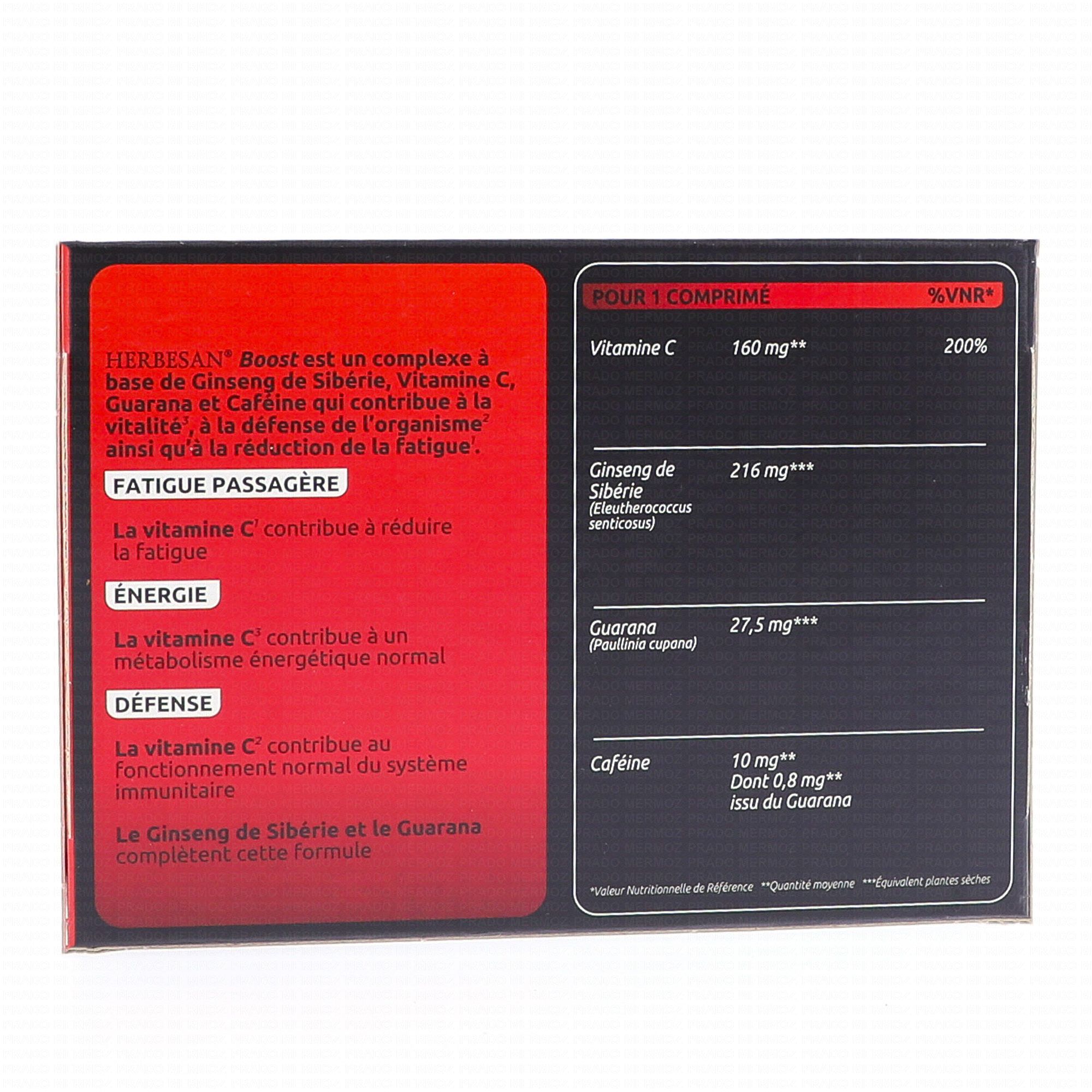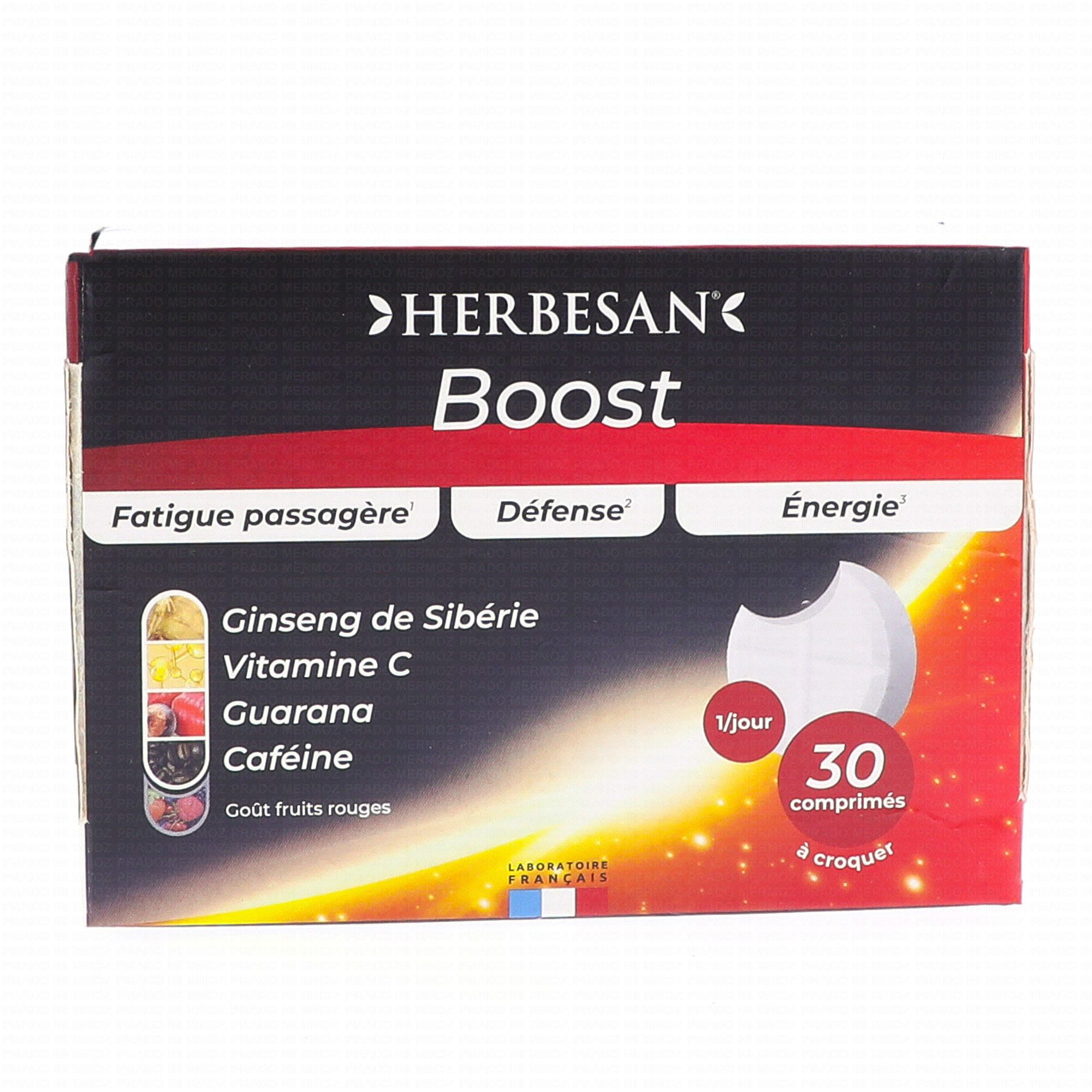 HERBESAN Boost 30 comprimés à croquer est un complément alimentaire qui contribue à renforcer les capacités physiques et mentales grâce à la présence d'Eleuthérocoque et de Guarana. La vitamine C aide à réduire la fatigue.