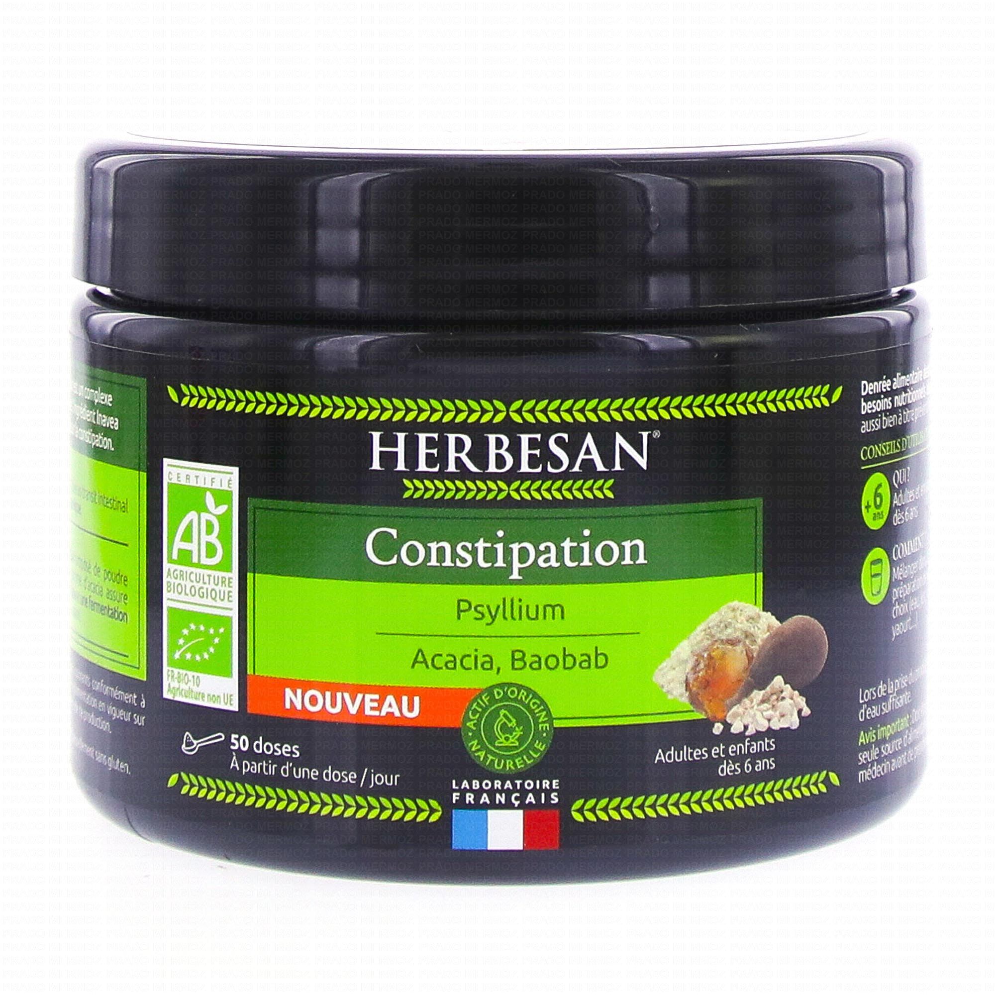 HERBESAN Constipation 184g est un complément alimentaire qui soutient le transit intestinal et la digestion grâce à la présence de Psyllium.