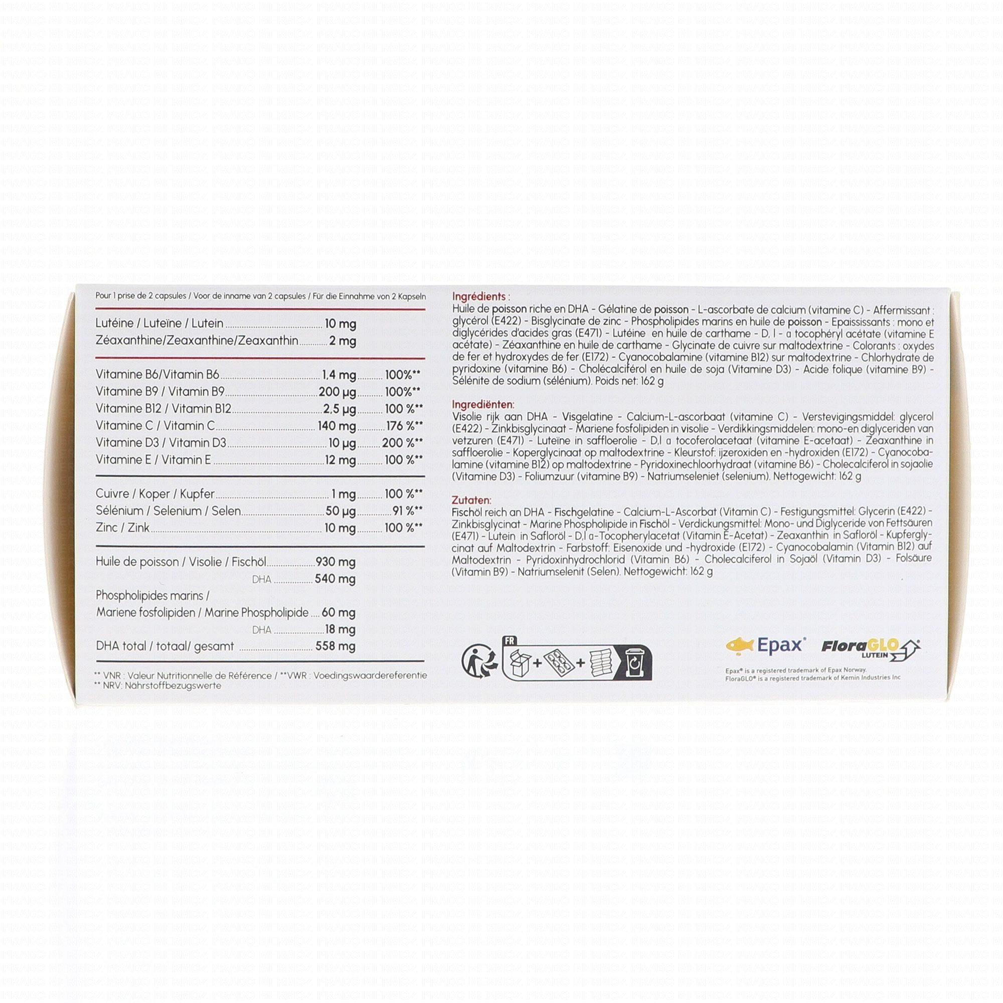 Huile de poisson riche en DHA, gélatine de poisson, L-ascorbate de calcium (vitamine C), affermissant : glycérol (E422), bisglycinate de zinc, phospholipides marins en huile de poisson, épaississants : mono et diglycérides d'acides gras (E471), lutéine en suspension à 20% en huile de carthame (extrait de la fleur de rose d'Inde : Tagetes erecta), D, l - α tocophéryl acétate (vitamine E acétate), zéaxanthine liquide à 14% en huile de carthame (extrait de la fleur de rose d'Inde : Tagetes erecta), glycinate de cuivre sur maltodextrine, colorant : oxydes de fer (E172), cyanocobalamine (vitamine B12) sur maltodextrine, chlorhydrate de pyridoxine (vitamine B6), cholécalciférol en huile de maïs (vitamine D3), acide folique (vitamine B9), sélénite de sodium (sélénium).