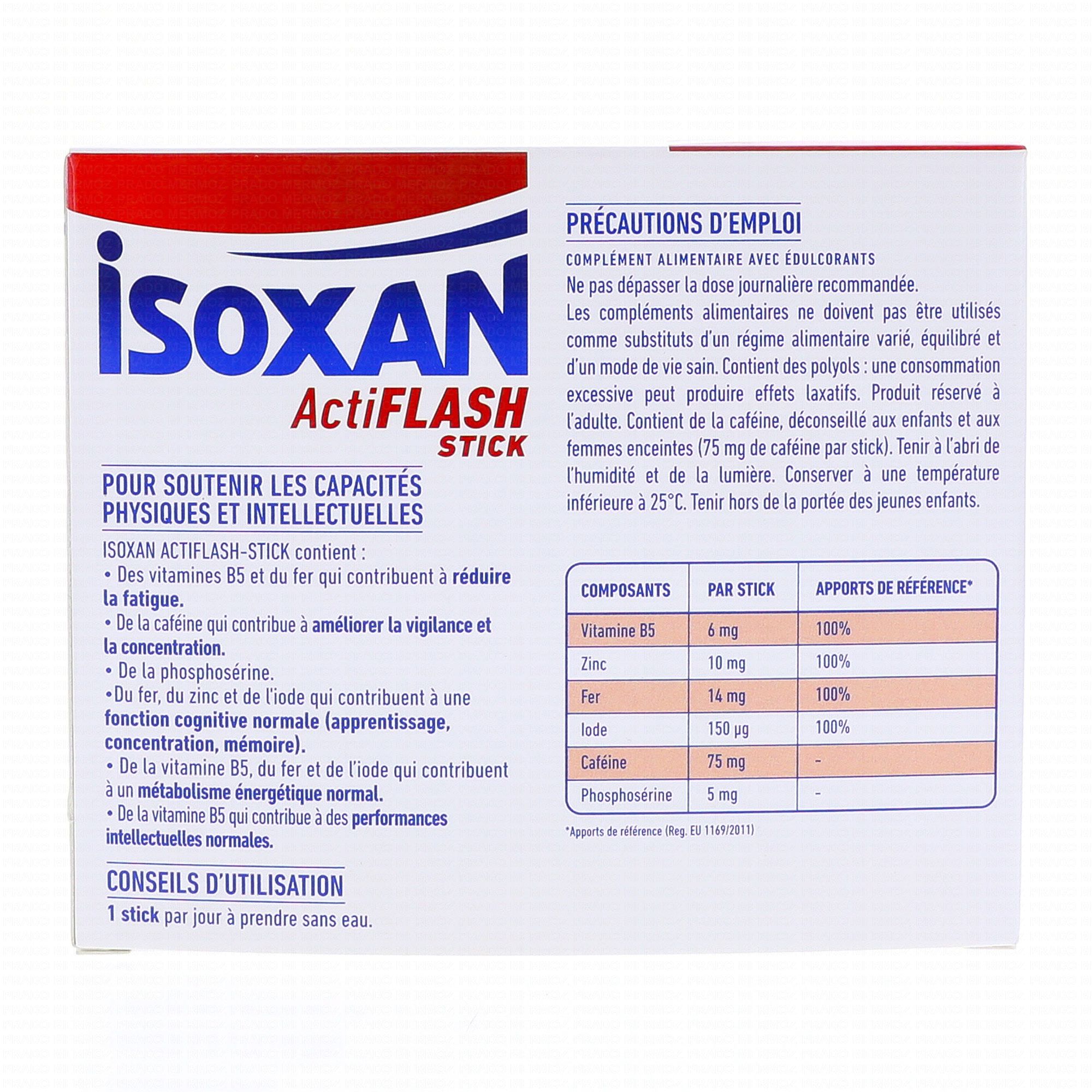 Valeurs nutritionnelles pour 1 stick: Vitamine B5: 6mg (soit 100% AR*) ; fer 14mg (soit 100% AR*); Zinc 10mg (soit 100% AR*) ; iode 150µg (soit 100% AR*) ; caféine 75mg ; phosphosérine 5 mg.
