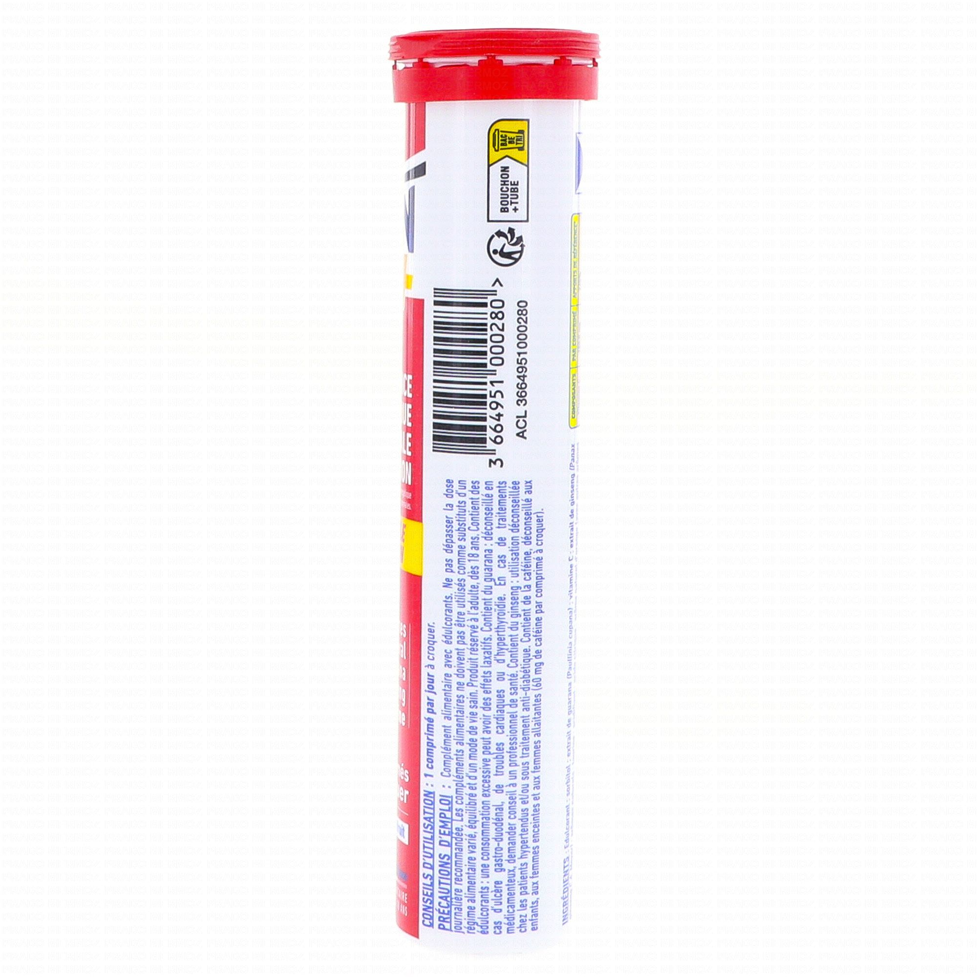 Edulcorant : sorbitol ; extrait de guarana (Paullinia cupana) ; vitamine C ; extrait de ginseng (Panax ginseng C.A. Meyer) ; taurine ; acidifiant : acide citrique ; arôme naturel d'orange (avec autres arômes naturels) ; arôme naturel de fruits de la passion ; arôme naturel ; anti-agglomérant : sels de magnésium d'acides gras ; citrate de zinc ; vitamine B3 ; édulcorants : sucralose, acésulfame de potassium, saccharinate de sodium ; vitamines : B1, B2, B6.