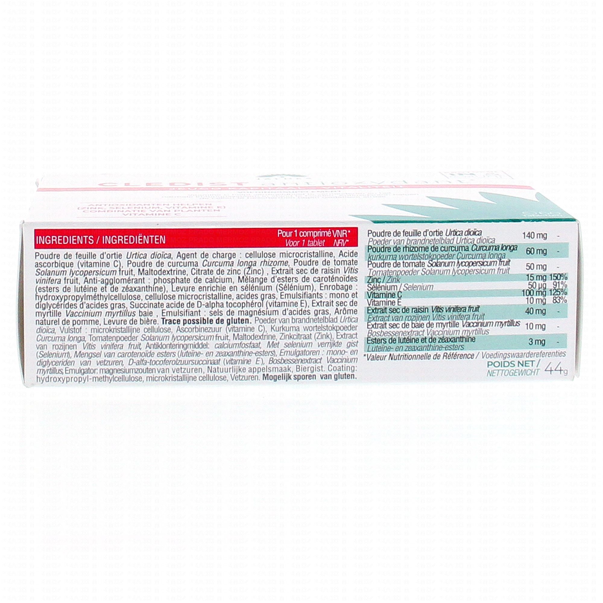 Poudre de feuille d'ortie Urtica dioïca. Agent de charge : cellulose microcristalline.Acide ascorbique (vitamine C). Poudre de rhizome de curcuma Curcuma longa, Poudre de tomate Solanum lycopersicum fruit, maltodextrine, citrate de zinc (Zinc), extrait sec de raisin Vitis vinifera fruit. Anti-agglomérant : phosphate de calcium. Levure enrichie en sélénium (Sélénium), mélange d'esters de caroténoïdes (esters de lutéine et de zéaxanthine). Emulsifiants : mono et diglycérides d'acides gras. Succinate acide de D-alpha tocophéryle (vitamine E). Extrait sec de baie de myrtille Vaccinium myrtillus. Emulsifiant : sels de m d'acides gras. Arôme naturel de pomme, Levure de bière. Enrobage : Hydroxypropylméthylcellulose, cellulose microcristalline, acides gras. Traces possibles de gluten.