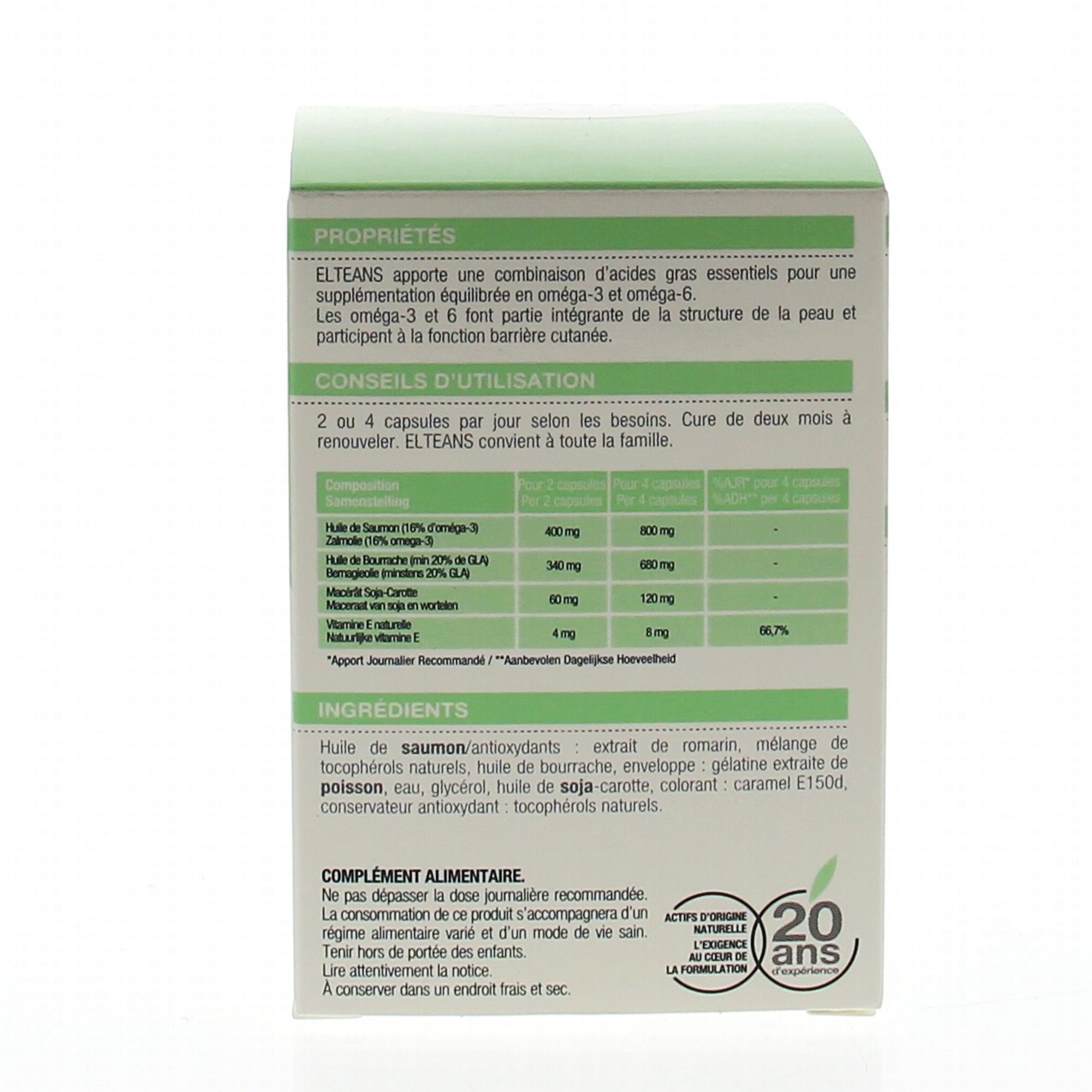 Eltéans prévient et corrige le vieillissement et le dessèchement cutané. Sa formule riche en acides gras essentiels a un rôle structural et fonctionnel dans toutes les membranes cellulaires. A base d'Oméga 3 et d'Oméga 6, riche en acides gras polyinsaturés à chaînes longues. Participe à la kératinisation de l'épiderme et à sa fonction hydrorégulatrice. Exerce un rôle sur la microcirculation et une activité antiinflammatoire. Conditionnement : sous blister, étui carton. prévention et correction du vieillissement cutané, prurit du sujet âgé, dessèchement cutanés intenses accompagnant les régimes amaigrissants, psoriasis, dermatite atopique.