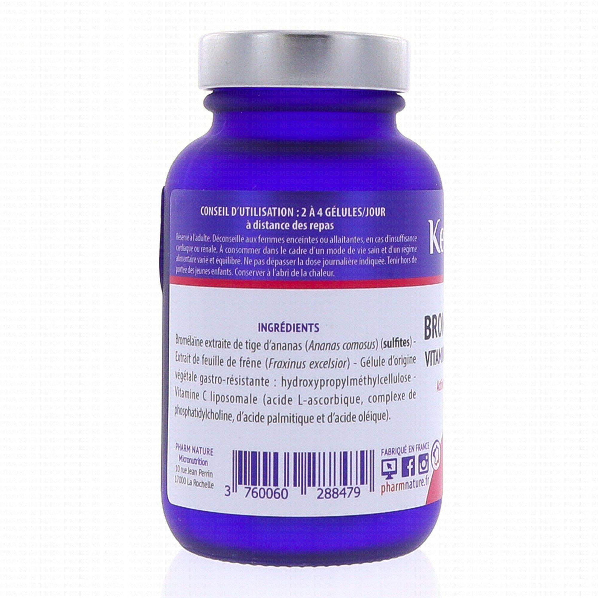Bromélaïne extraite de tige d'ananas (Ananas comosus) (sulfites) – Extrait de feuille de frêne (Fraxinus excelsior) – Gélule d'origine végétale gastro-résistante : hydroxypropylméthylcellulose – Vitamine C liposomale (acide L-ascorbique, complexe de phosphatidylcholine, d'acide palmitique et d'acide oléique).