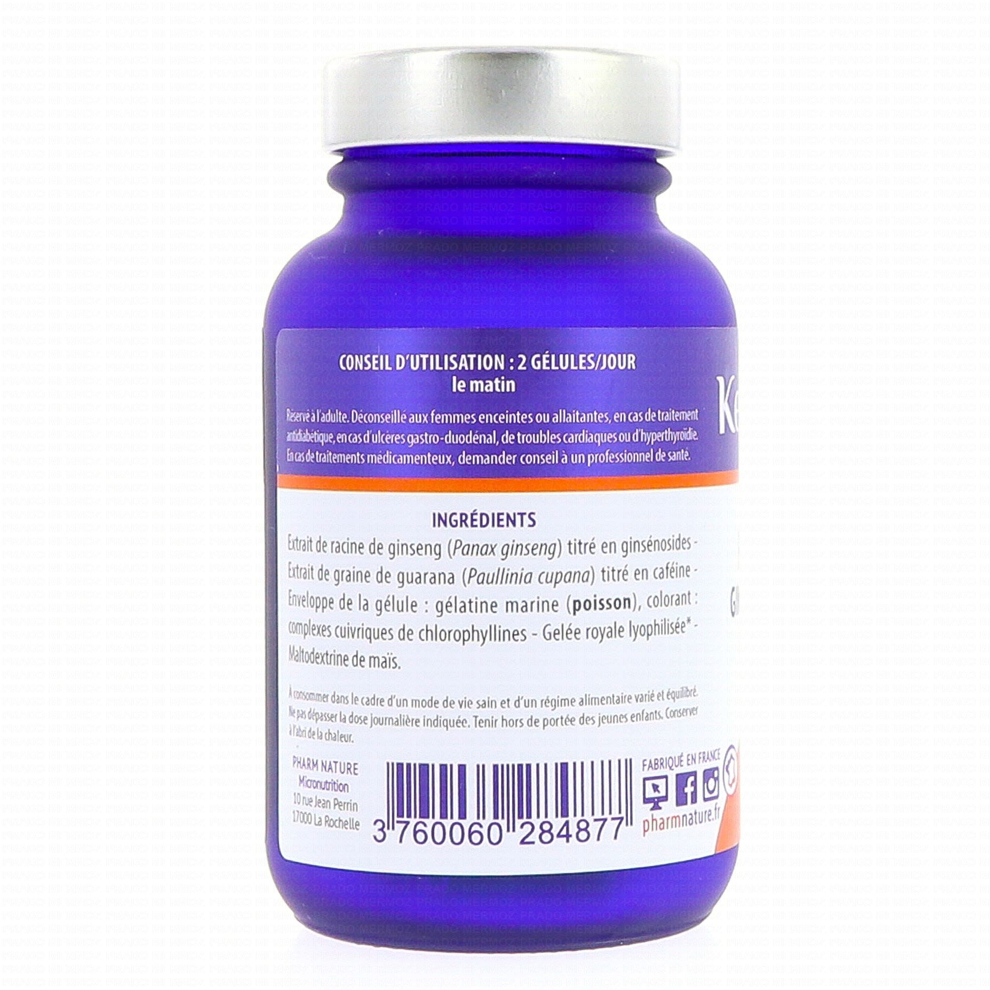 Extrait de racine de ginseng (Panax ginseng) titré en ginsénosides – Extrait de graine de guarana (Paullinia cupana) titré en caféine – Enveloppe de la gélule : gélatine marine (poisson), colorant : complexes cuivriques de chlorophyllines – Gelée royale lyophilisée – Maltodextrine de maïs.