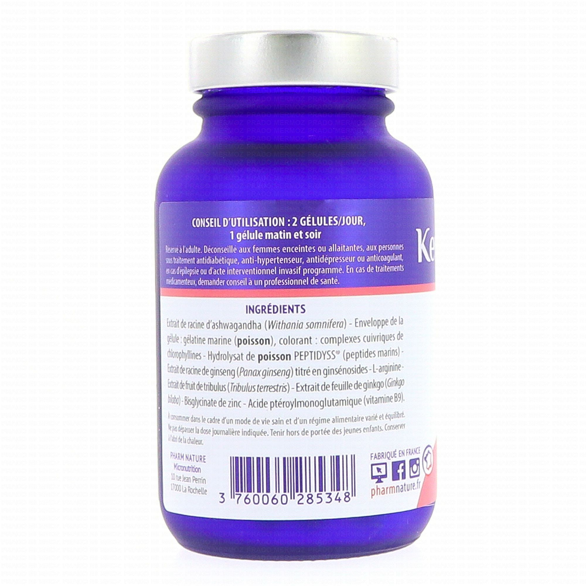 Extrait de racine d'ashwagandha (Withania somnifera) – Enveloppe de la gélule : gélatine marine (poisson), colorant : complexes cuivriques de chlorophyllines – Hydrolysat de poisson PEPTIDYSS® (peptides marins) – Extrait de racine de ginseng (Panax ginseng) titré en ginsénosides – L-arginine – Extrait de fruit de tribulus (Tribulus terrestris) – Extrait de feuille de ginkgo (Ginkgo biloba) – Bisglycinate de zinc – Acide ptéroylmonoglutamique (vitamine B9)¿.