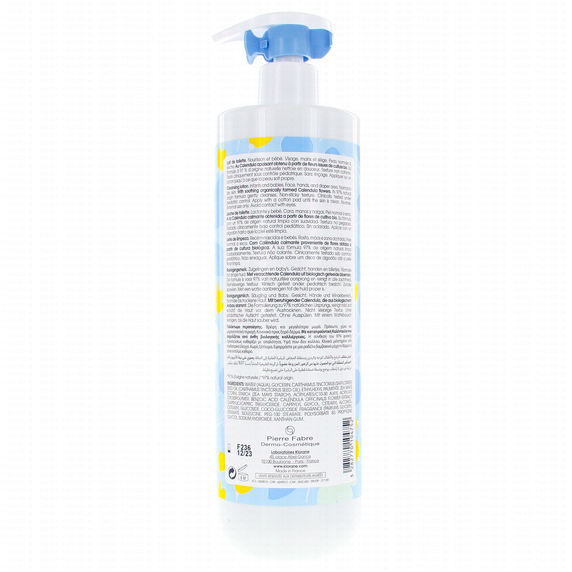 Lait de toilette. Nourrissons. 97% d'ingrédient d'origine naturelle. Testé cliniquement sous contrôle pédiatrique. Formule non collante.