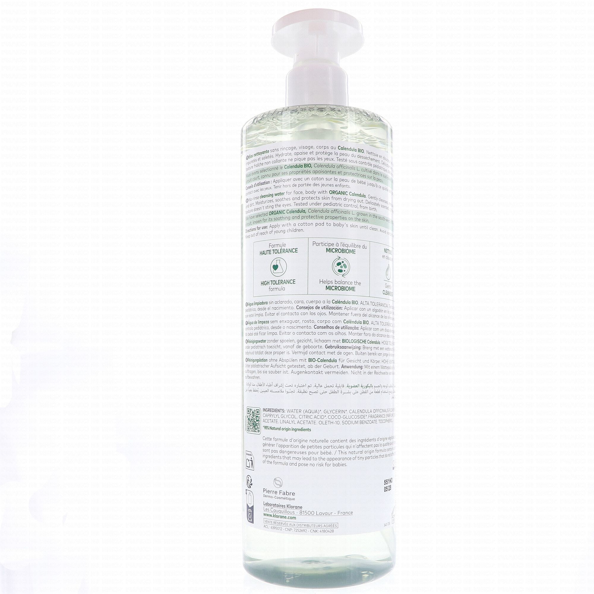Idéale pour nettoyer et apaiser la peau du bébé, l'eau micellaire de Klorane est composée de Calendula, aux propriétés apaisantes et réparatrices, d'actifs hydratants qui rendent sa peau douce et apaisée. Apaisante, adoucissante, hydratante, protectrice et réparatrice. Sans paraben, sans alcool. Hypoallergénique. Conditionnement : flacon pompe.