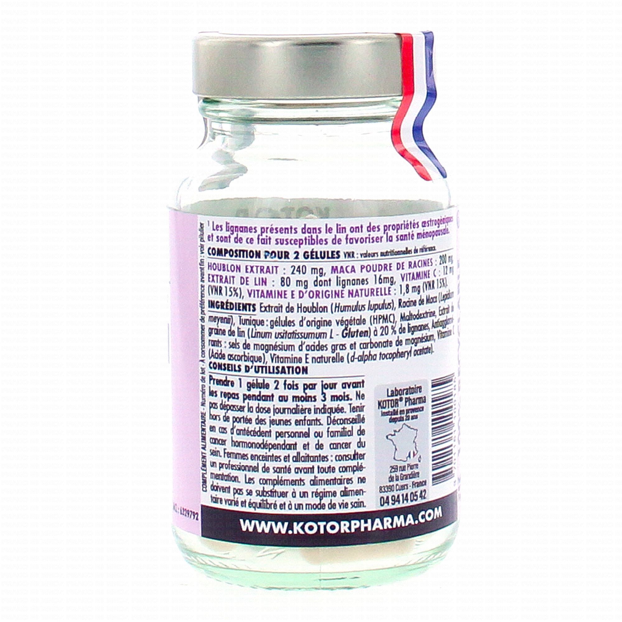 KOTOR Méno 45 flacon de 60 gélules est un complément alimentaire qui aide les femmes à faire face aux signes révélateurs associés à la ménopause, comme les bouffées de chaleur, la transpiration, l'agitation et l'irritabilité grâce à la présence de Houblon. La graine de Lin intervient dans le confort au cours de la ménopause