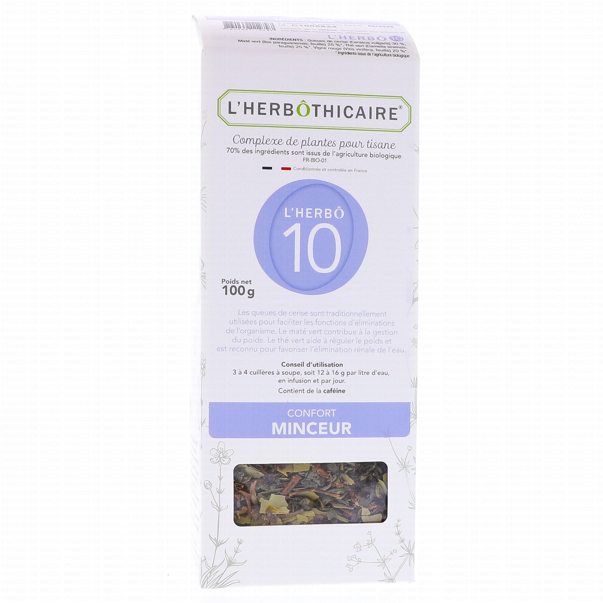 L'HERBÔTHICAIRE L'Herbô 10 - Confort Minceur Complexe de Plantes pour Tisane Bio 100g est une préparation qui contribue à la perte de poids dans le cadre d'un régime adapté grâce à la présence de Thé vert, de Vigne Rouge et de Maté.