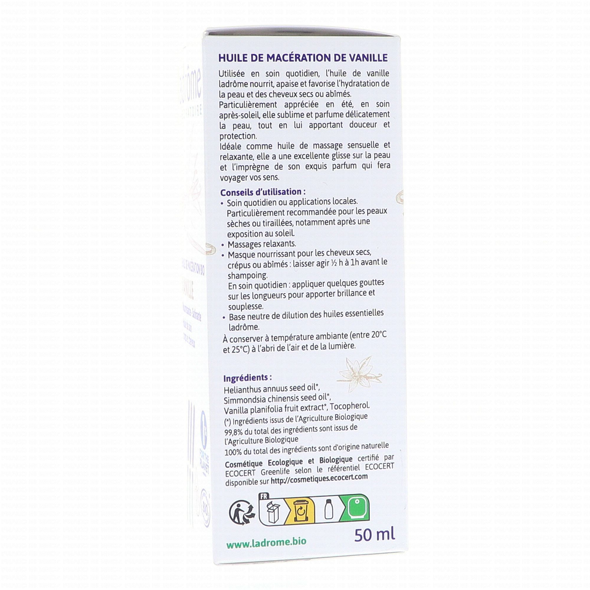 Ladrôme Huile de Macération de Vanille Bio 50 ml est une huile de macération de vanille. Utilisée en soin quotidien, l'huile de vanille nourrit, apaise et favorise l'hydratation de la peau et des cheveux secs ou abîmés. Particulièrement appréciée en été, en soin après-soleil, elle sublime et parfume délicatement la peau, tout en lui apportant douceur et protection. Idéale comme huile de massage sensuelle et relaxante, elle a une excellente glisse sur la peau et l'imprègne de son exquis parfum qui fera voyager vos sens.