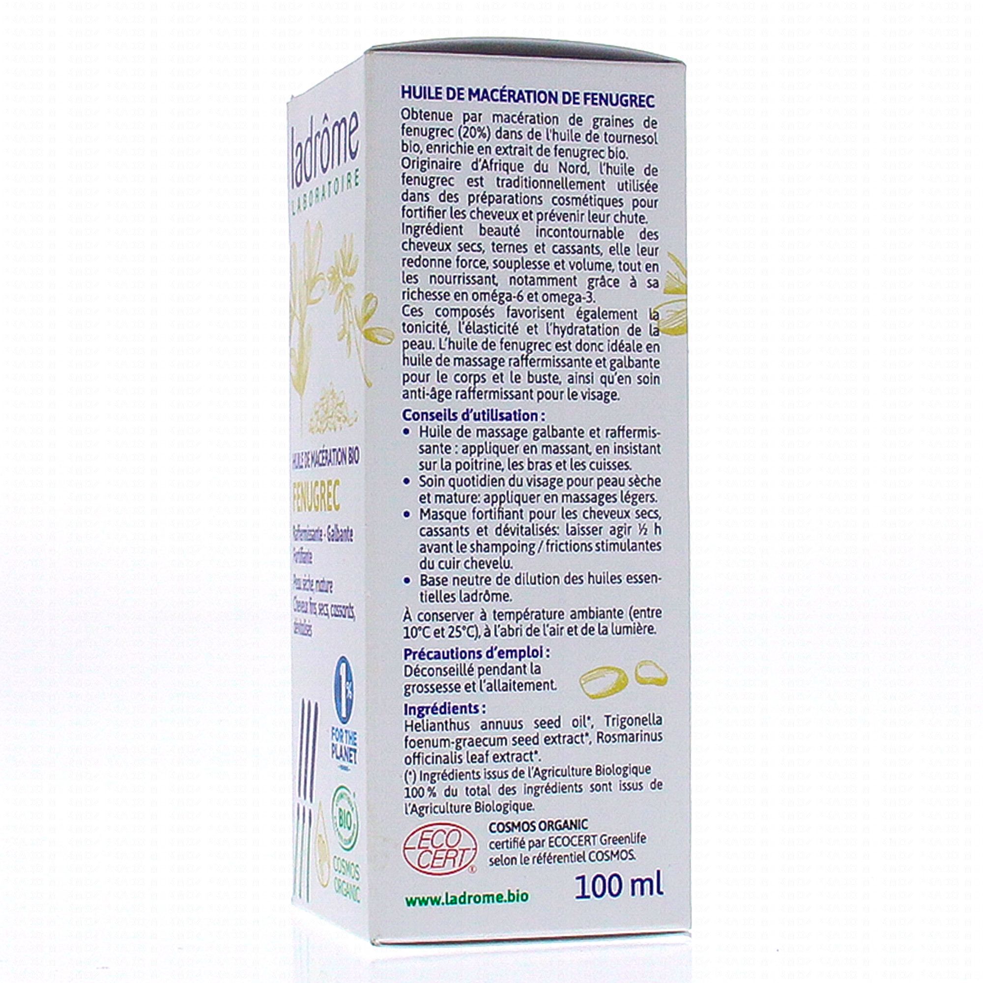 L'huile de macération de fenugrec bio Ladrôme est obtenue à partir de graines de fenugrec qui ont été mises à macérer dans de l'huile de tournesol bio enrichie en extrait de fenugrec bio. Le fenugrec (Trigonella foenum graecum), également appelé sénégrain ou trigonelle est une plante qui était utilisée dès le Moyen-Age notamment pour prévenir la chute des cheveux et fortifier la fibre capillaire. Riche en omega 3 et en omega 6, l'huile de macération de fenugrec va nourrir les cheveux secs, cassants et fatigués et leur redonner force et vigueur. Elle va également prévenir leur chute. L'huile de tournesol quant à elle va redonner galbe et volume à vos cheveux. La richesse en vitamines et acides gras essentiels des huiles végétales de fenugrec et de tournesol est également un atout pour les peaux sèches et matures. En effet, l'huile de macération de graines de fenugrec va nourrir et hydrater la peau et contribuer à la régénération de son film protecteur. La peau redevient douce et confortable et retrouve son élasticité et sa fermeté.