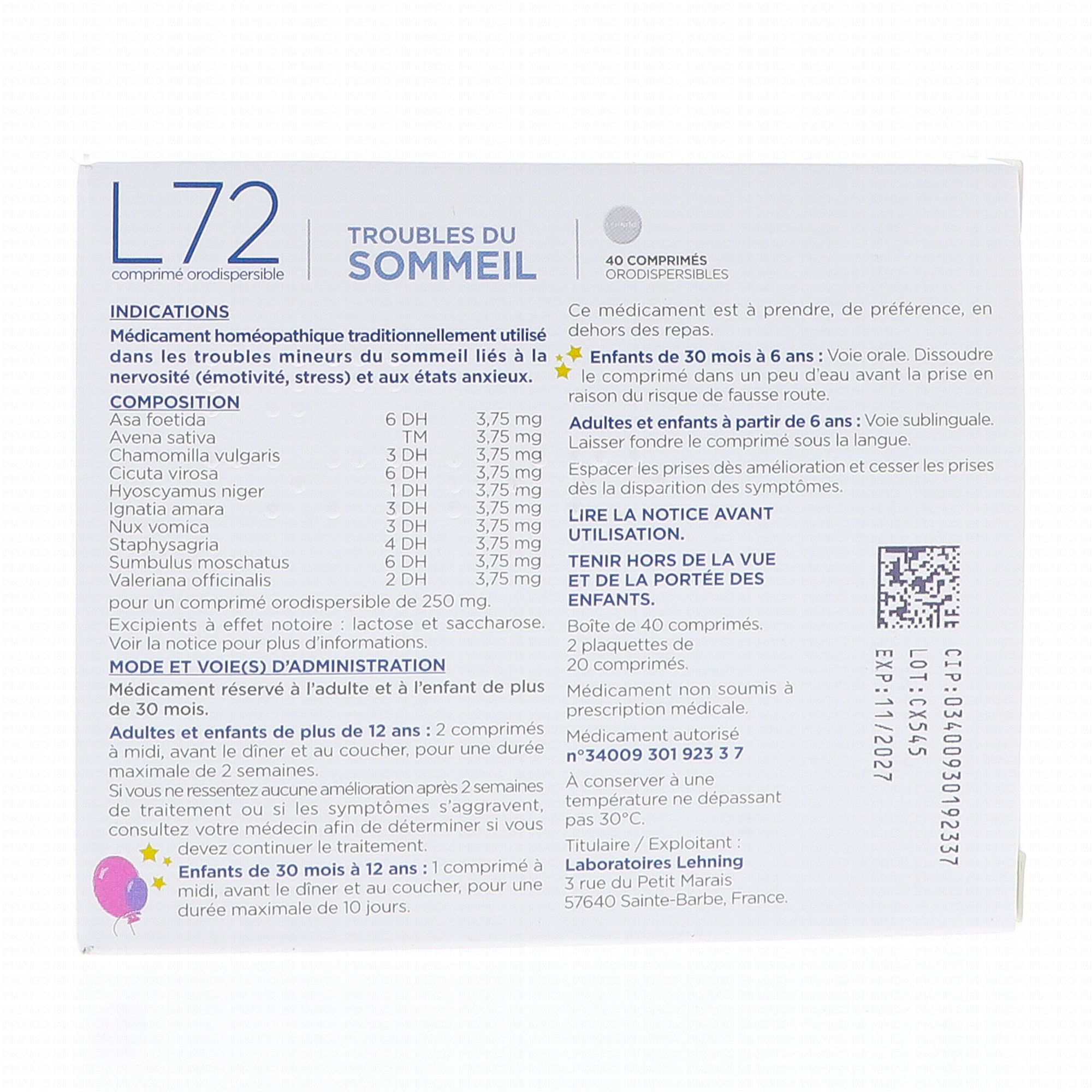 L72, comprimé orodispersible est un médicament homéopathique traditionnellement utilisé dans les troubles mineurs du sommeil liés à la nervosité (émotivité, stress) et aux états anxieux.