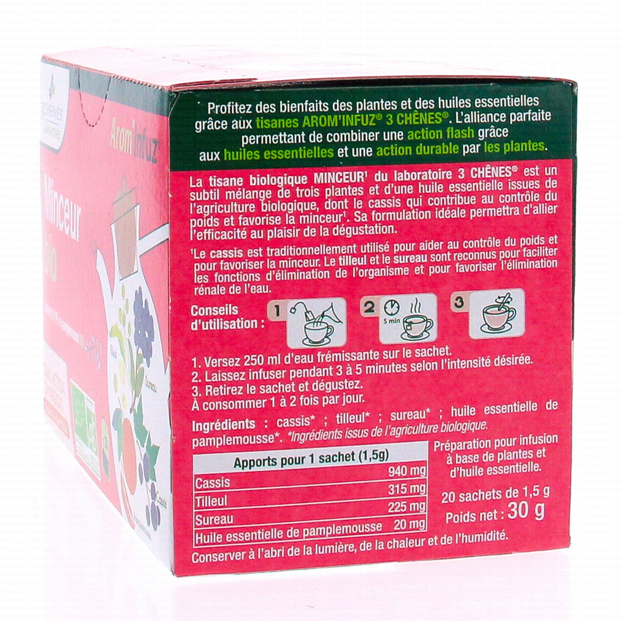 LES 3 CHENES Arom'Infuz Minceur Tisane bio x20 sachets est un complément alimentaire qui contribue à la perte de poids dans le cadre d'un régime adapté grâce à la présence de Sureau et de Cassis.