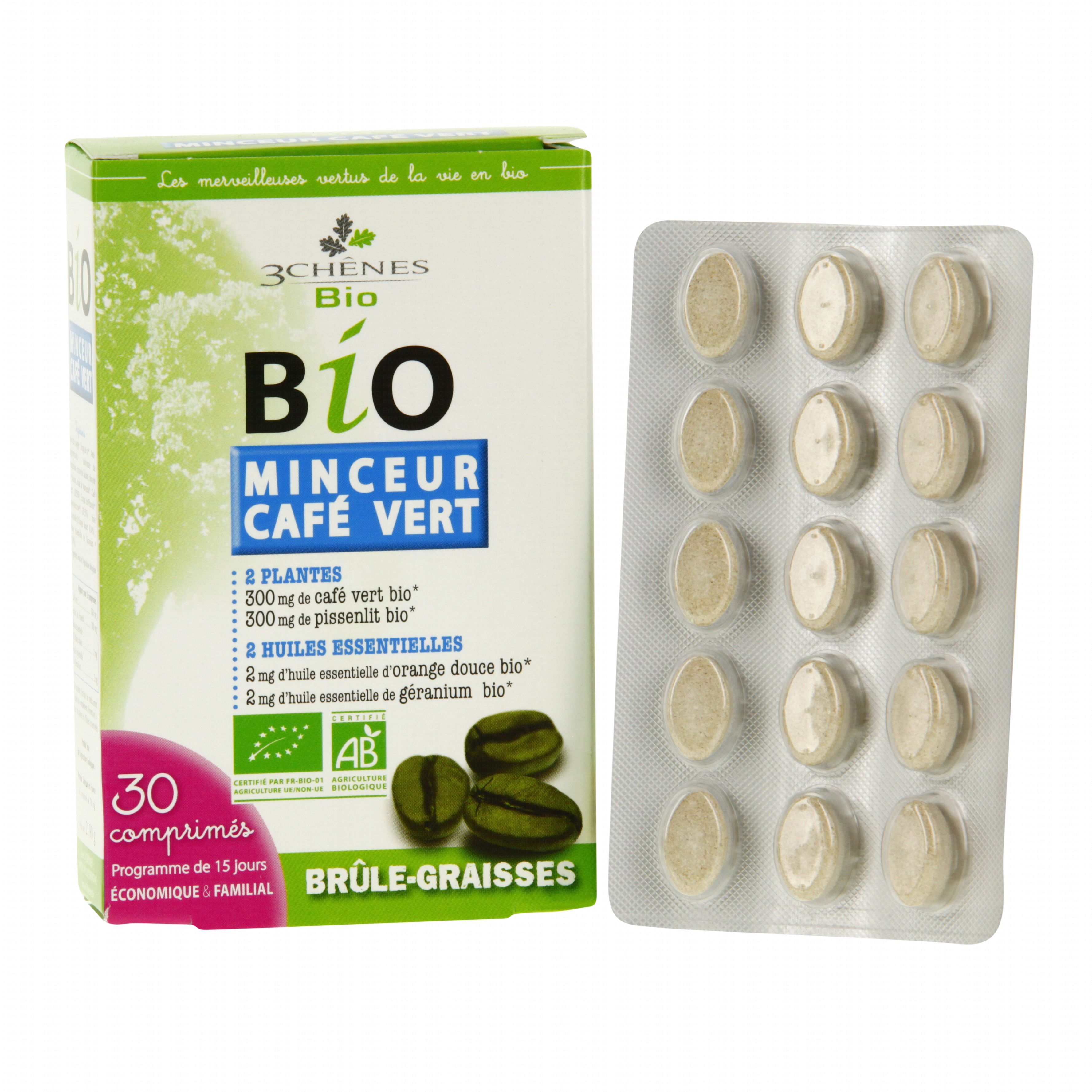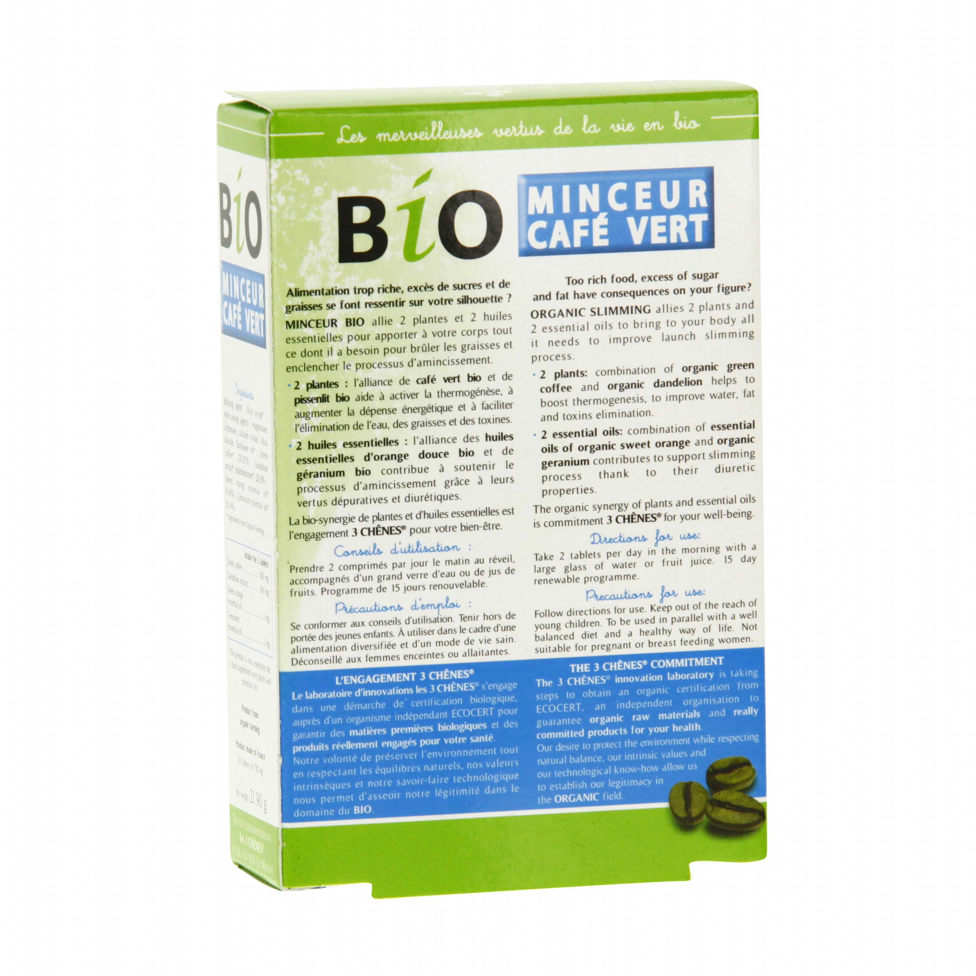Formulé à base de l'association de café vert, orange douce, géranium et pissenlit, les comprimés Bio Minceur optimise l'augmentation de la thermogenèse. Produit issu de l'agriculture biologique. Conditionnement : étui carton.