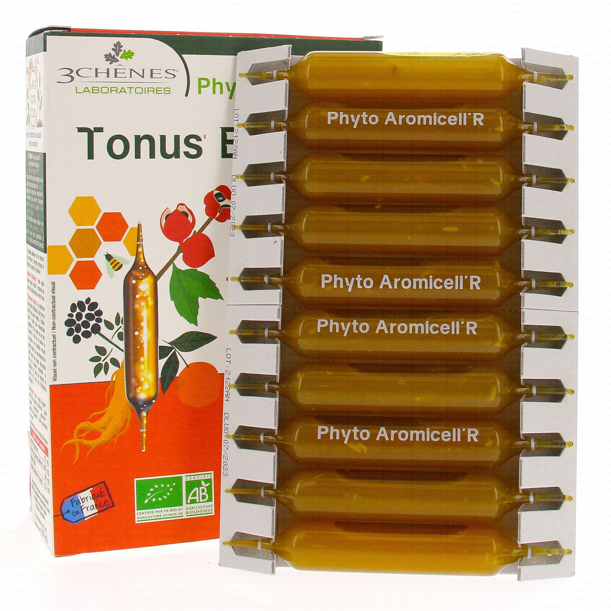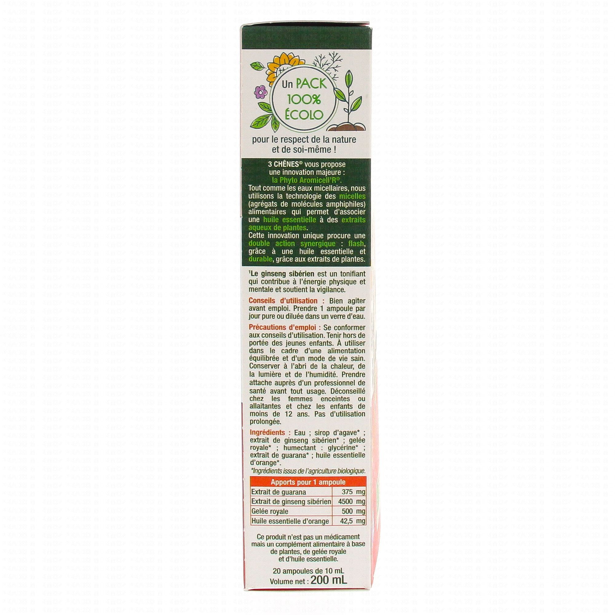 LES 3 CHENES Phyto Aromicell'R Tonus Energie 20 ampoules contient les éléments suivants :