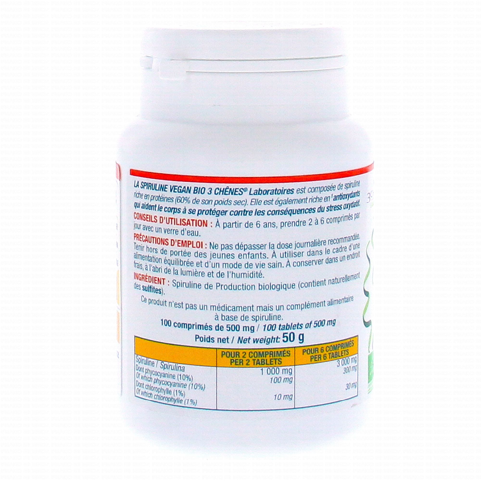 LES 3 CHÊNES Spiruline de production biologique 100 comprimés contient les éléments suivants :