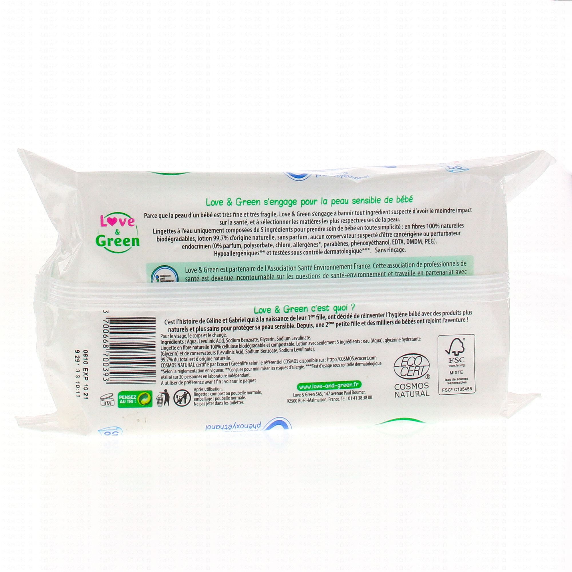 En fibre 100% naturelles biodégradables, les lingettes Love & Green nettoie la peau sensible de bébé grâce a sa composition simple et naturelle, sans parfum, sans conservateur ni aucune substance cancérigène ou perturbateur endocrinien.